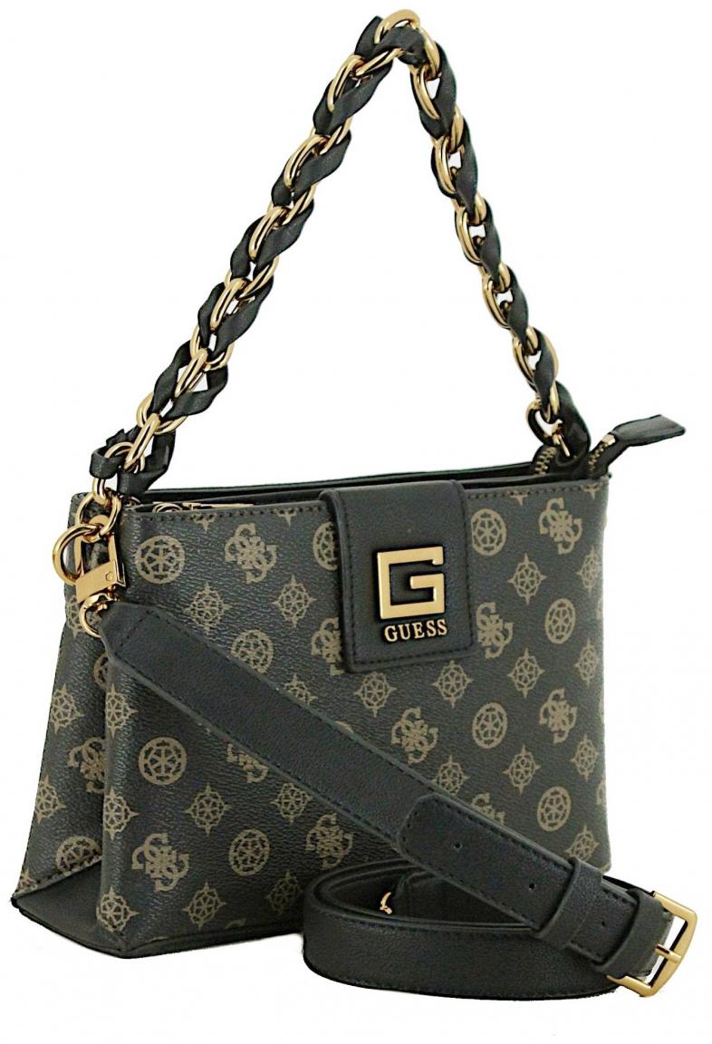 In zeitloser Eleganz mit einem Hauch Extravaganz zeigt sich diese Abendtasche aus der Serie Alva Mini von Guess. Festes, strukturiertes Kunstleder im Design Brown Logo ist allover mit einem braunen Print des Peony- und 4G-Logos bedruckt. Glänzend messingfarbene Metallelemente harmonieren hervorragend mit der Farbgebung der Schultertasche.