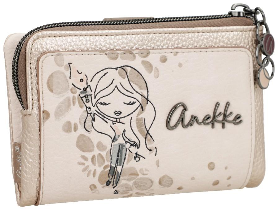 Gefertigt ist das Portemonnaie aus Kunstleder in hellem Beige/Nude. Die Vorderseite des Wallets zeigt das charakteristische Portrait von Anekke, diesmal mit der olympischen Fackel in der Hand, als zarte Konturstickerei. Betont durch einen zarten, aquarellartigen Print wird das Motiv perfekt in Szene gesetzt.