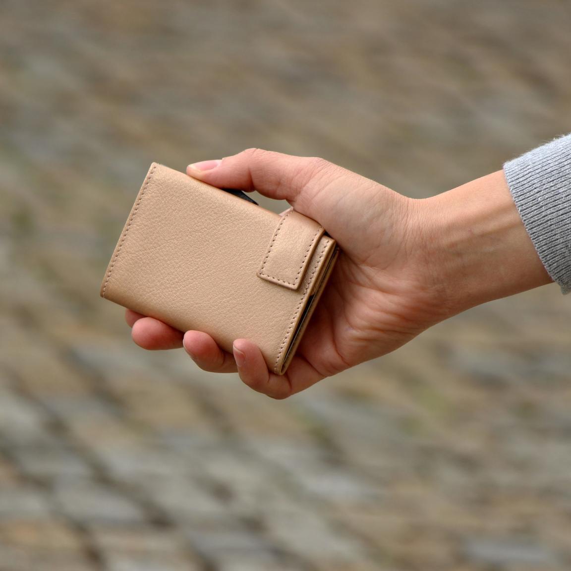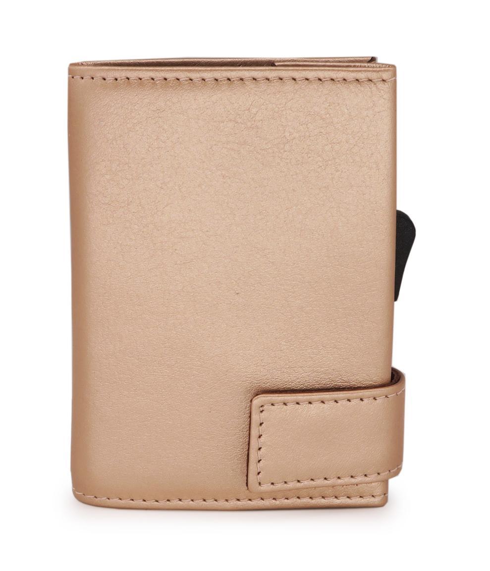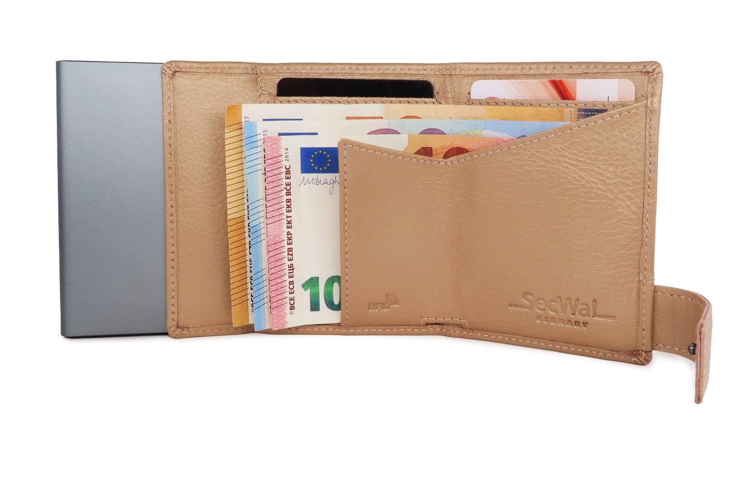 Das praktische Etui mit Münzfach von SecWal ist aus hochwertigem Leder in der Farbe rosé metallic gefertigt. Die mittige Metallhülle für die Aufbewahrung von Karten besteht aus Aluminium. Durch Betätigung des seitlichen Schiebers der Kartenhülle werden die Karten nach oben herausgeschoben und sind übersichtlich aufgefächert ganz einfach zu entnehmen. Die Karten sind in der Hülle sicher aufgehoben und können nicht herausrutschen, egal ob eine oder mehr Karten im Etui aufbewahrt werden.