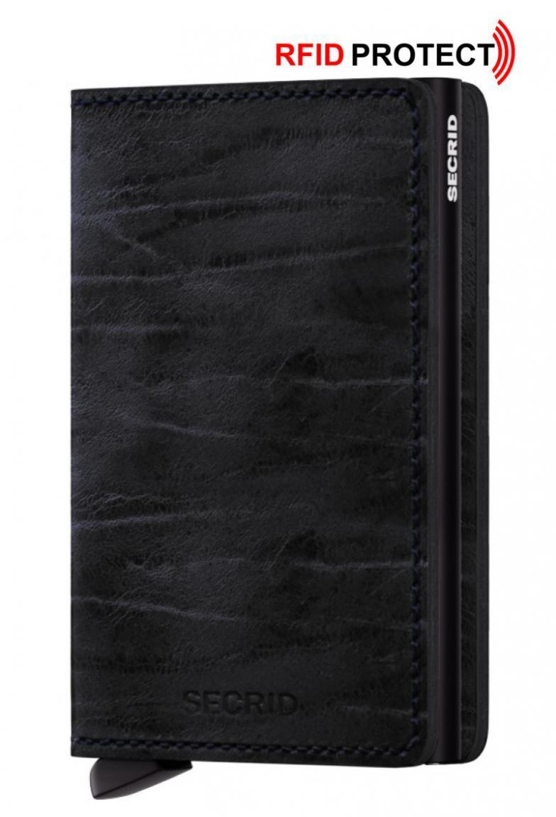 Die RFID Protect Kartenhülle Slimwallet der Marke Secrid, ist außen aus einem hochwertigen Rindleder mit starker Maserung (sichtbare Falten im Leder) gefertigt und hat innen eine Metallhülle für Karten.