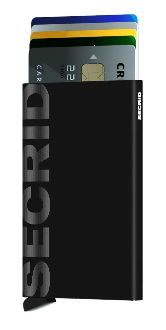 Diese Kreditkartenhülle Laser Logo Black der niederländischen Firma Secrid ist aus Leichtmetall in schwarz gefertigt und auf einer Seite mit einer Lasergravur mit Markenlogo versehen.