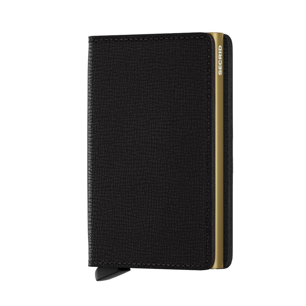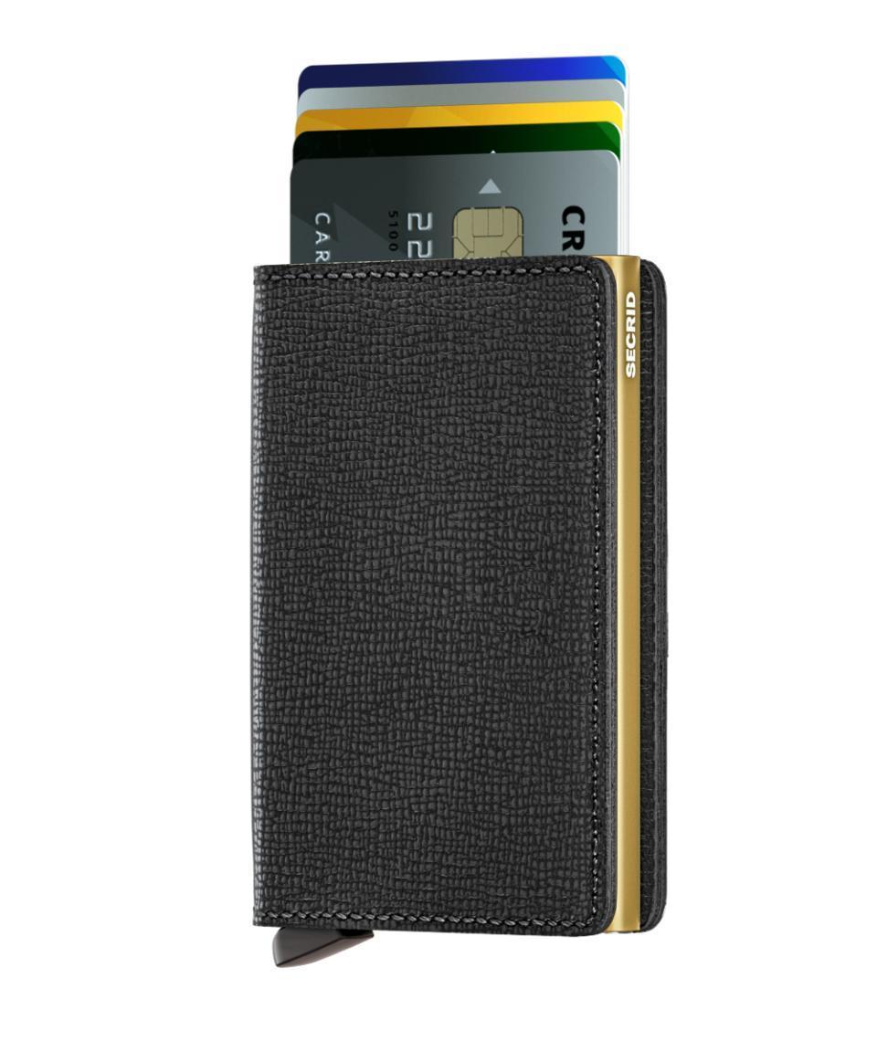 Das handliche Kartenetui Slimwallet Crisple Black der niederländischen Firma Secrid ist außen aus hochwertigem Saffiano Leder in der Farbe Schwarz gefertigt. Um dieses langlebige und pflegeleichte Leder herzustellen, wird nach dem Gerbeprozess das feinstrukturierte Muster eingeritzt und erhält so das für Saffiano Leder typische Muster. Die innere Aluminium Metallhülle in der Farbe Gold, von Secrid Cardprotector genannt, kann bis zu sechs Karten aufbewahren. Das Besondere an dem Cardprotector ist der RFID-Schutz, welchen die Metallhülle bietet. Ihre auf Chipkarten (Bank- und Kreditkarten, Schlüsselkarten, etc.) gespeicherten Daten sind somit vor unerwünschtem und unbemerktem Auslesen geschützt.