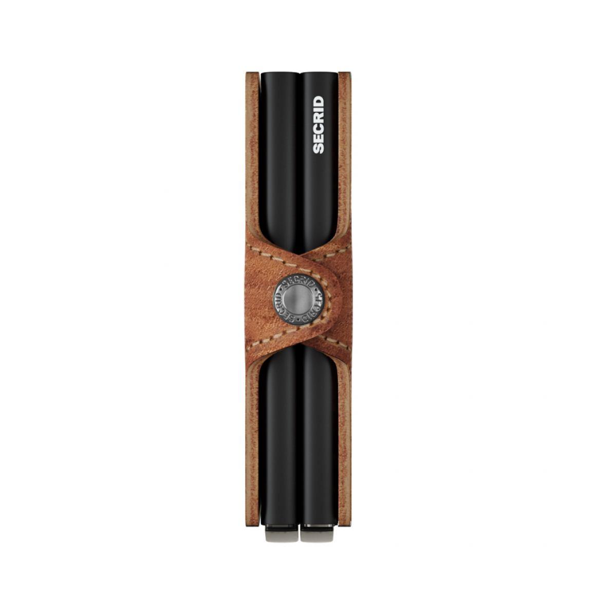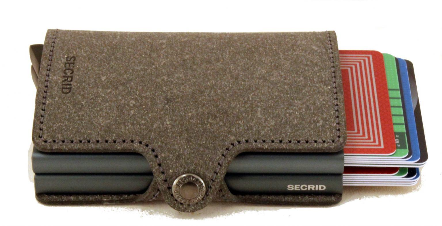 Der RFID Cardprotect doppelt Twinwallet der Marke Secrid, ist außen aus einem hochwertigen Rindleder mit starker Maserung (sichtbare Falten im Leder) gefertigt und hat innen zwei Metallhüllen für Karten.