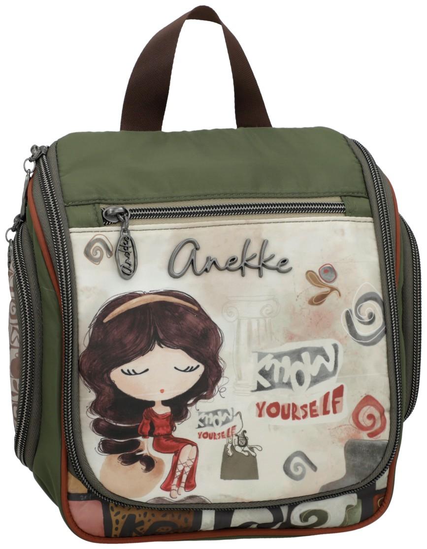 Gefertigt ist Toilettetasche ist aus dichtem Nylongewebe. Ein Portrait von Anekke im Stil einer der Musen ziert die Vorderseite des Kulturbeutels.