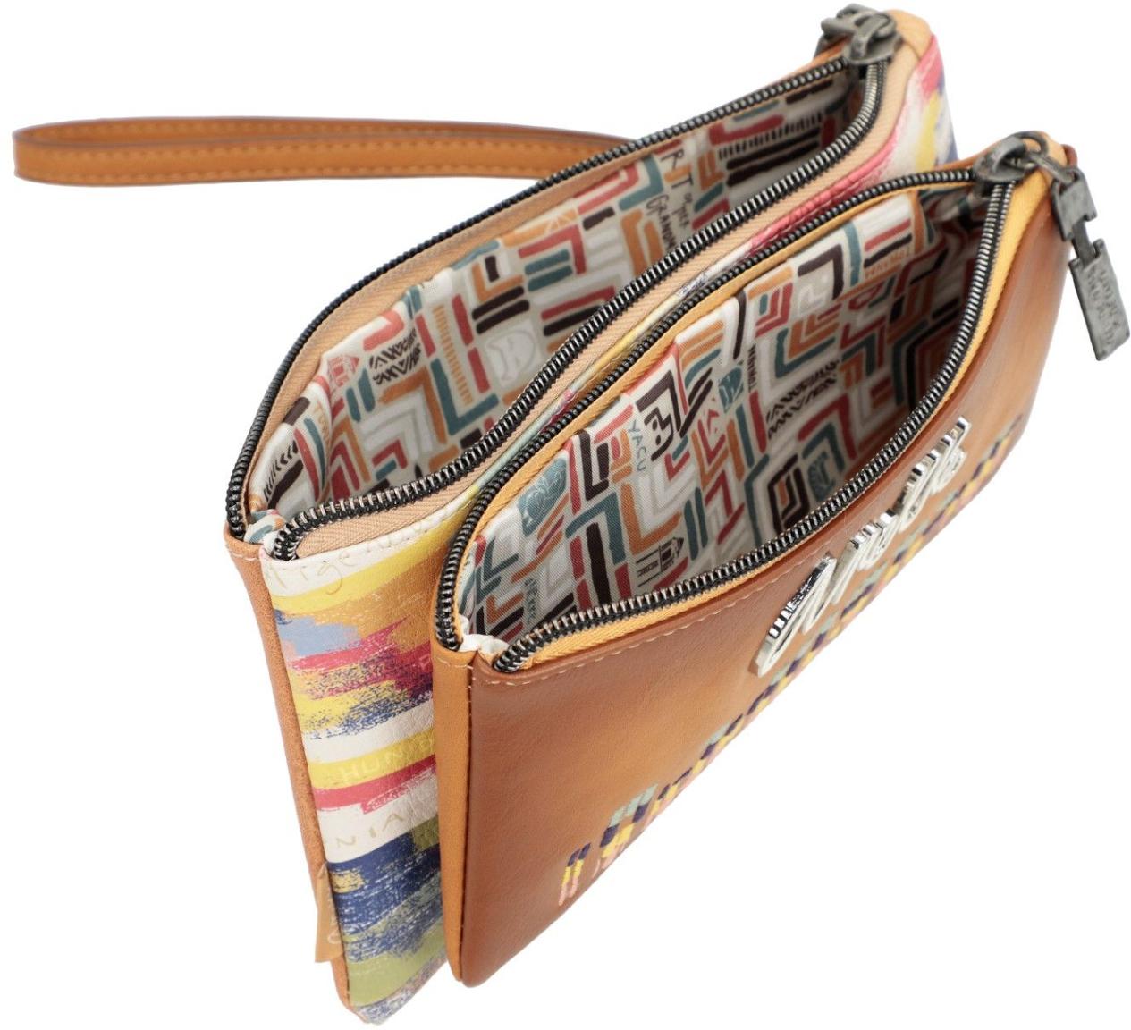 Die Vorderseite des Täschchens ziert eine farbenfrohe Stickerei, die genau für diese kreative Schöpfung stehen soll. Der auffällige weiße Markenschriftzug auf braunem Kunstleder macht das Kosmetiktäschchen zum echten Blickfang.