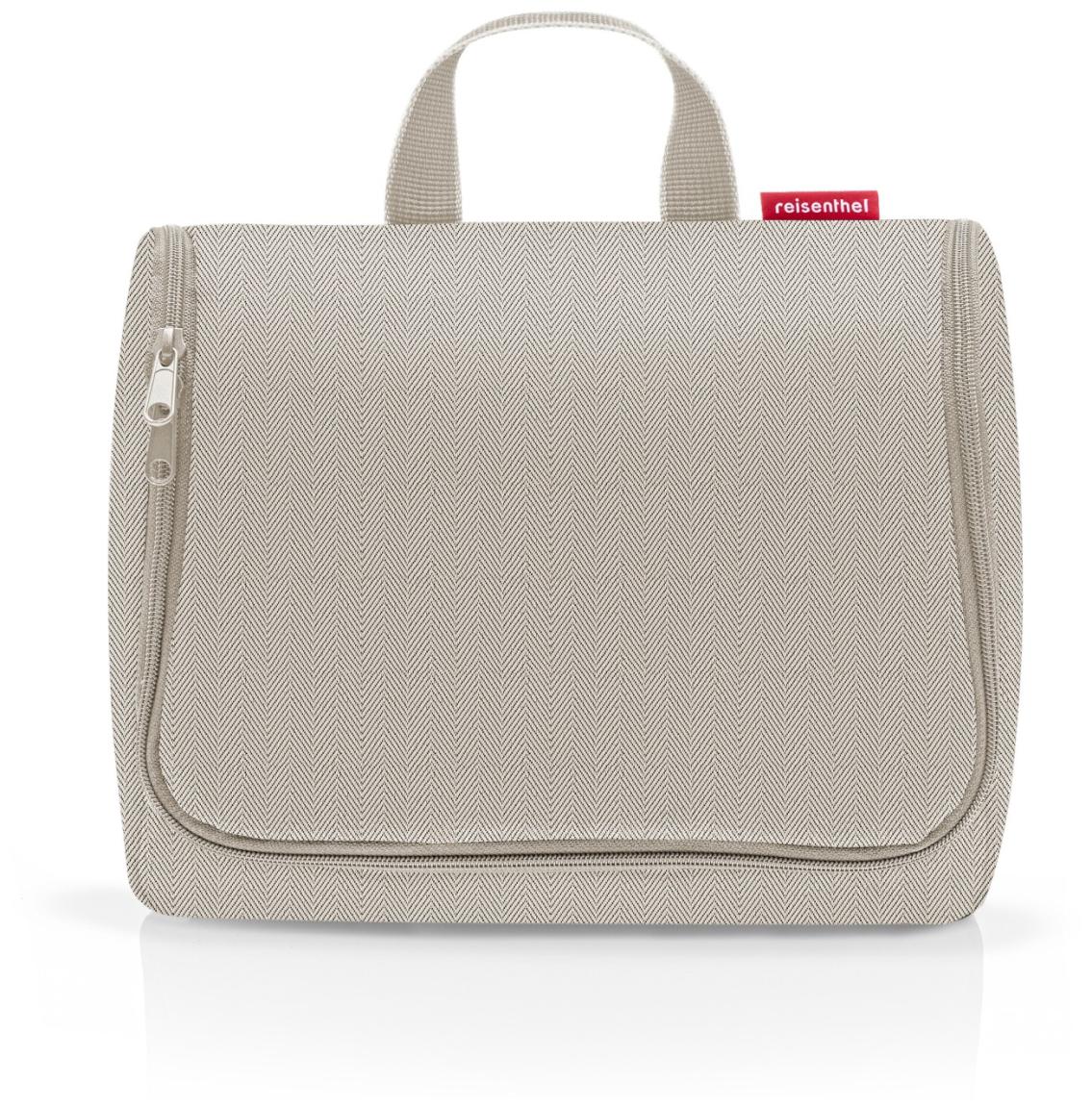 Ein Accessoire, das auf keiner Reise fehlen darf, ist die Kosmetiktasche Toiletbag XL von reisenthel. Gefertigt ist die Kulturtasche aus dichtem Gewebe im Design Herringbone Sand (hellbeiger Fischgrat). Die Kosmetiktasche verfügt neben der übersichtlichen Einteilung auch über einen praktischen Haken zum Aufhängen. Das leicht gepolsterte Material der Kulturtasche ist zudem wasserabweisend.