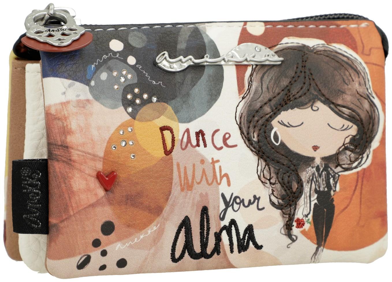 Anekkes Heimatland Spanien stand Pate für die Kollektion Alma. Inspiriert von den warmen Farben und traditionellen Mustern, der Musik - von der Seele des Landes ist das Design für diese kleine Münzbörse entstanden. Die Vorderseite des Etuis zeigt den charakteristischen Print mit Anekke, die sich diesmal als feurige Spanierin präsentiert. Zarte Stickereien, funkelnde Steine und der abstrakte Print rücken das Motiv ins rechte Licht. Auch der außergewöhnlich gestaltete Markenschriftzug aus silberfarbenem Metall fügt sich harmonisch in das Design der Geldbörse ein.