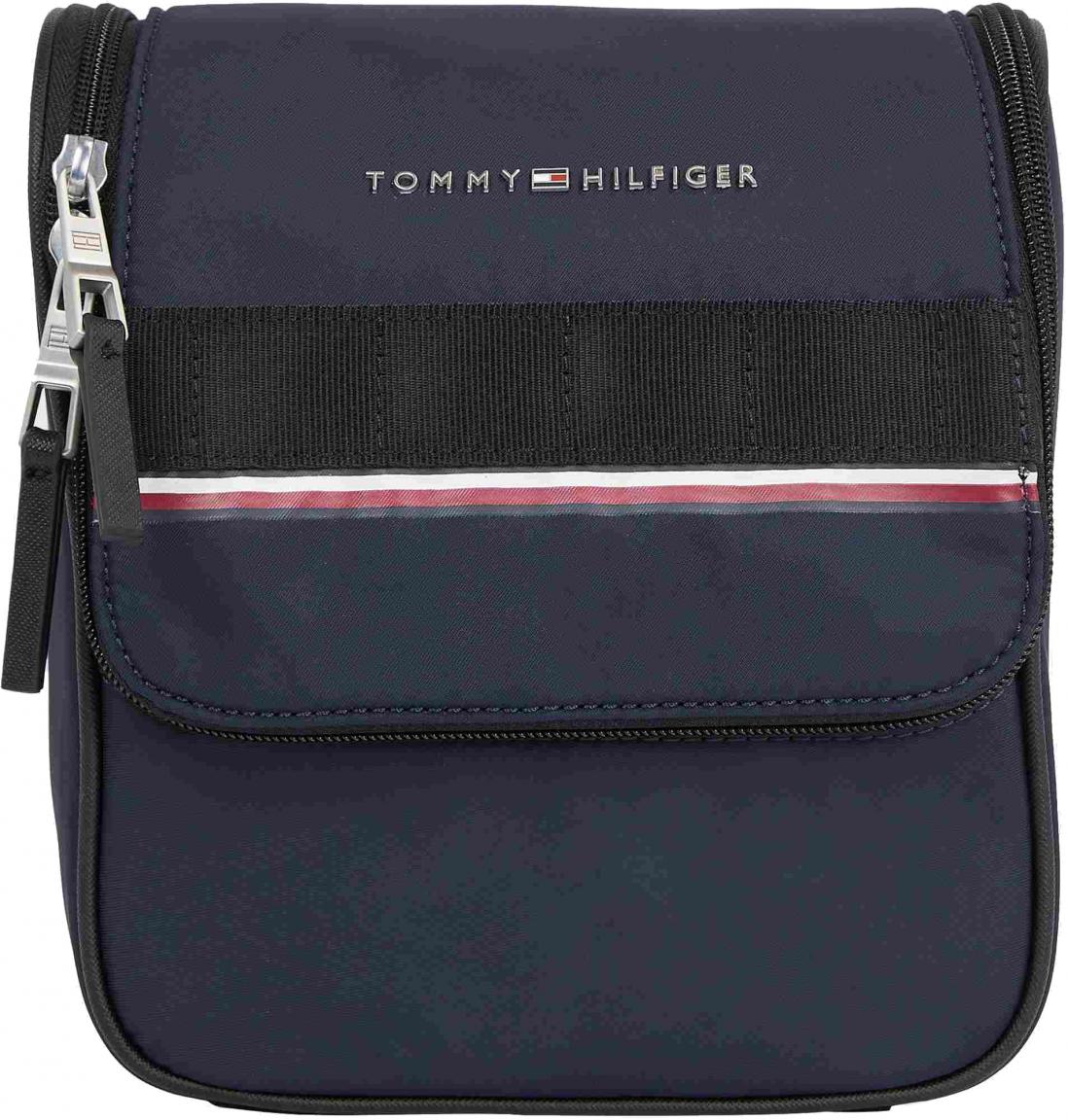 Die praktische Washbag von Tommy Hilfiger in der Farbe Space Blue, blau, ist aus leicht abwischbarem Nylon gefertigt. Den typischen Hilfiger Stil erhält die Washbag durch die Flagstripes und die metallic Applikation des Markennamens auf der Vorderseite.