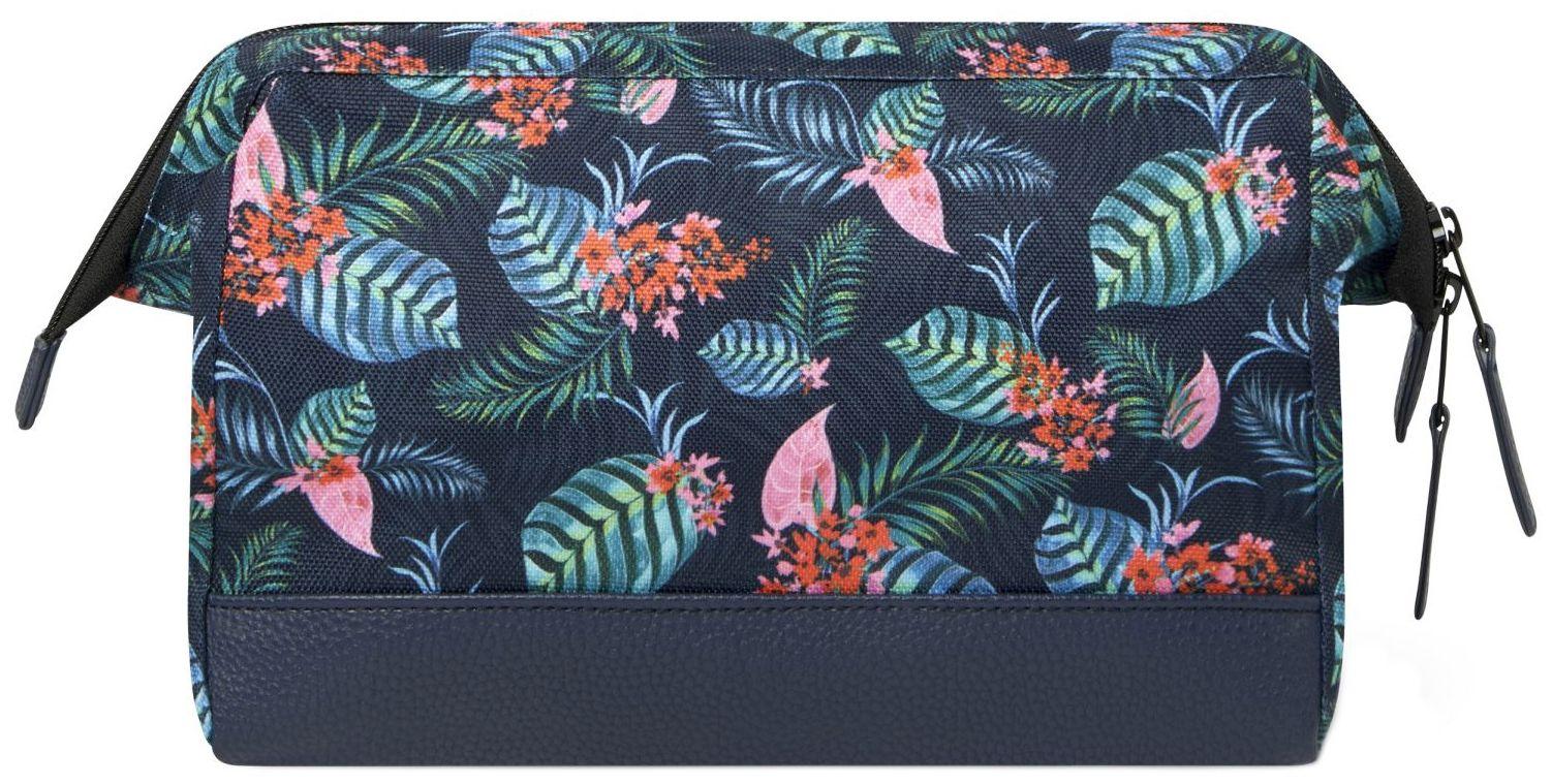 Der Kulturbeutel im femininen Design Rue du Thabor ist aus nachhaltigem Kunstfasergewebe in der Farbe Navy (Dunkelblau) mit auffälligem tropischen Print gefertigt. Details aus veganem Kunstleder in Navy sorgen für den sportlichen Look des Etuis.