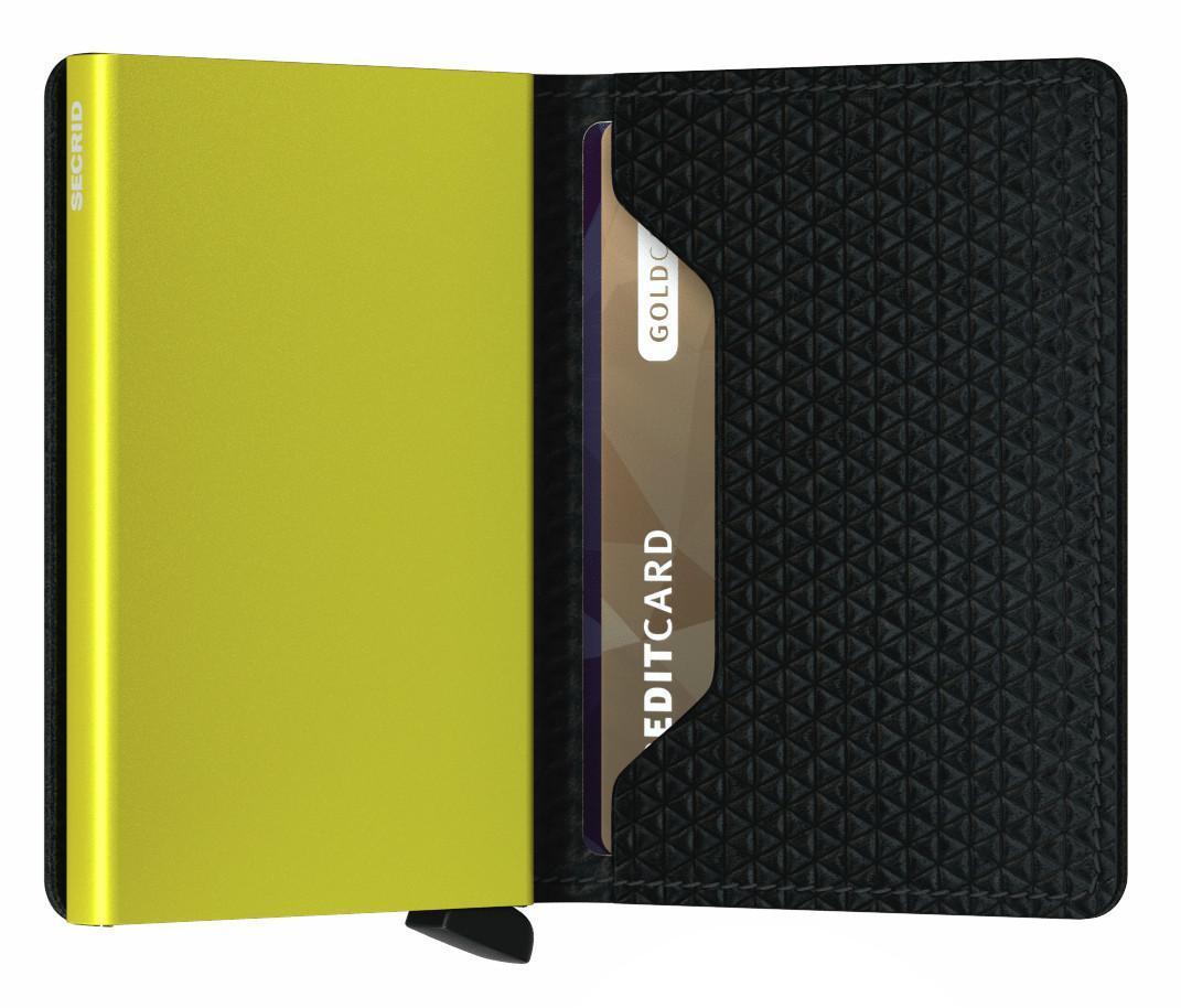 Das praktische Kartenetui Slimwallet Diamond Black der niederländischen Firma Secrid ist außen aus hochwertigem Rindleder in schwarz gefertigt und besitzt innen eine gelbe Metallhülle für Karten. In die Oberfläche des Leders ist ein Diamantmuster eingearbeitet.