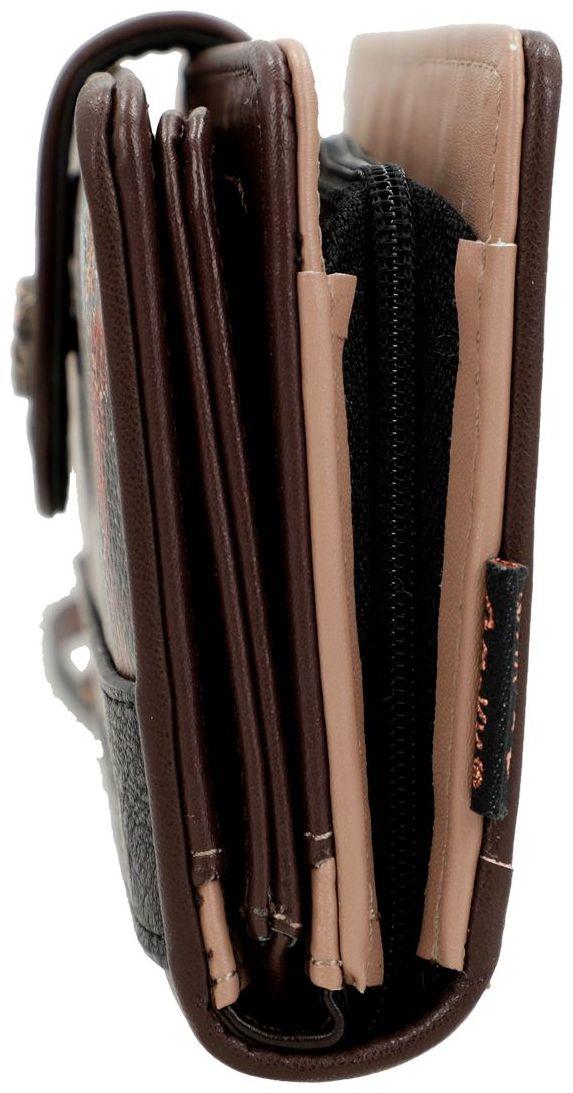 Das Portemonnaie wird per Lasche und Druckknopf verschlossen. Mit der abnehmbaren Handschlaufe kann die Geldbörse sicher transportiert werden. Im Inneren ist die Damenbörse in Beige und Braun gehalten. Die einzelnen Fächer des Portemonnaies sind mit thematisch und farblich abgestimmtem Textilfutter ausgestattet.