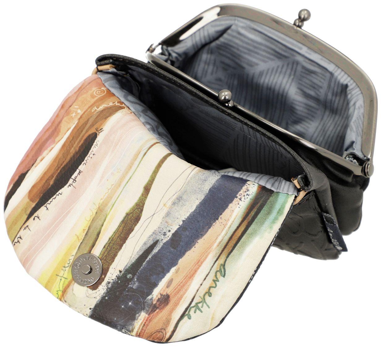 Geschlossen wird die zweigeteilte Münzbörse mittels Überschlag und Magnet. Eines der Fächer ist zusätzlich mit einem Bügelverschluss (Kisslock) zu öffnen. Im Inneren ist die Überschlagbörse mit einem abgestimmten Textilfutter ausgestattet.