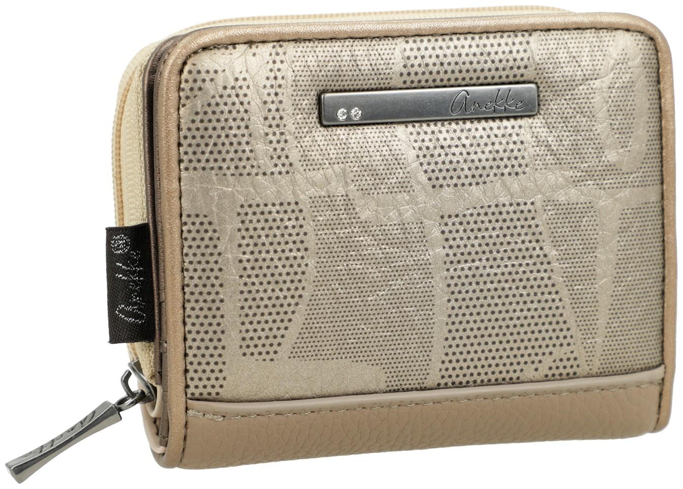 Die Vorderseite des Portemonnaies zeigt einen außergewöhnlichen Dotprint auf goldenem Untergrund. Ein ähnliches Muster in invertierten Farben zeigt sich auch an der Rückseite der Börse.