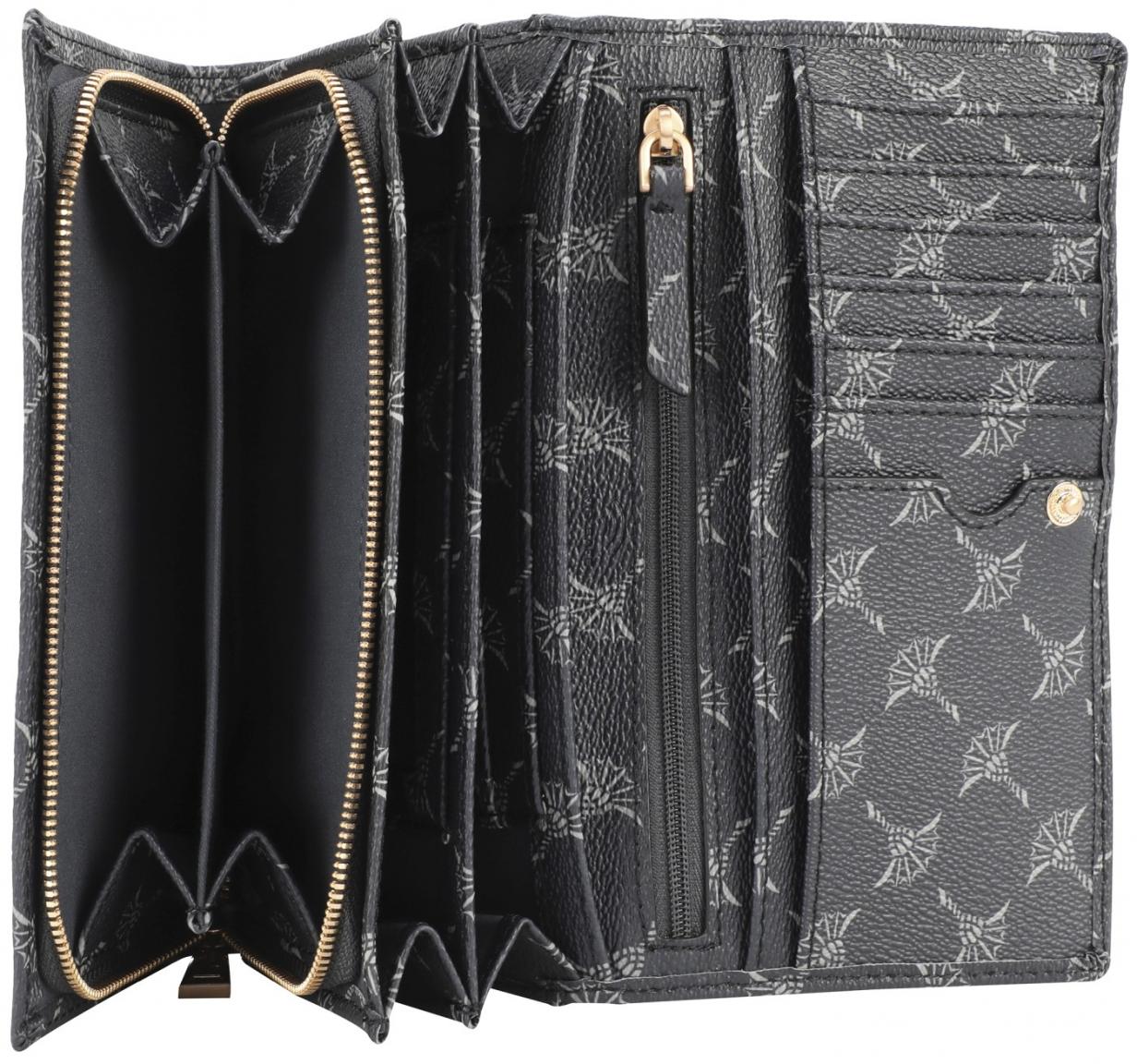 Als besonders edles Accessoire zeigt sich die Brieftasche Purse LH10F von Joop! Die Geldbörse aus der Serie Cortina 1.0 ist aus strukturiertem Lederimitat im Farbdesign Dark Blue (dunkelblau) gefertigt. Der Alloverprint des ikonischen Cornfloer-Logos sorgt für den unverwechselbaren Signature Look des Portemonnaies. An der Vorderseite und am Zipper der Überschlagbörse zeigt sich ebenfalls das Markenlogo.
