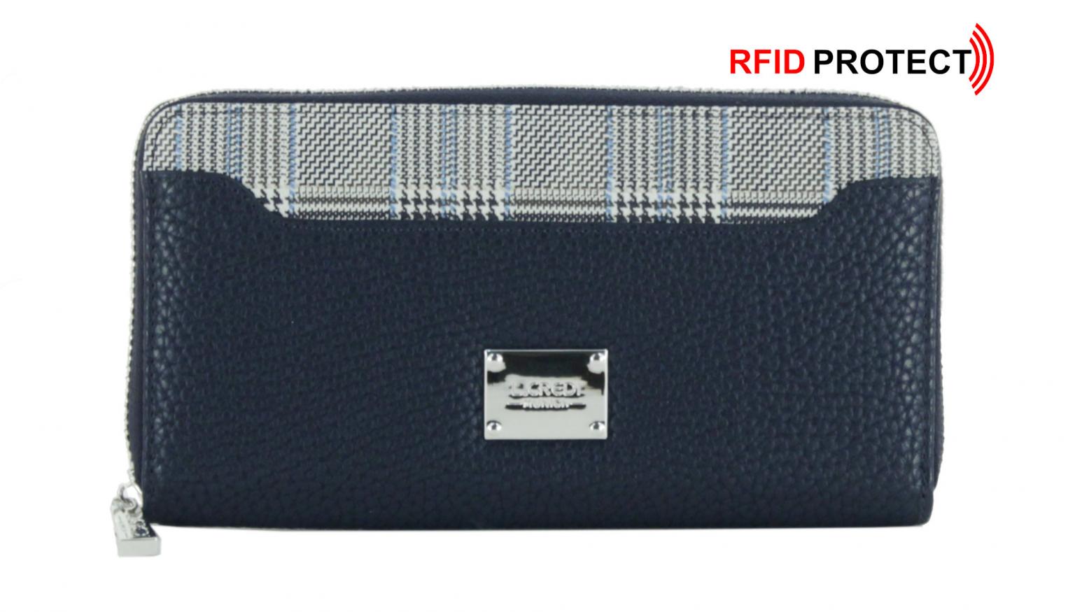 Die Geldbörse aus der Serie Davinavon L.Credi ist aus hochwertigem genarbtem Lederimitat gefertigt. Der Einsatz mit Glencheck-Print an der Vorderseite macht das Portemonnaie zu einem richtigen Blickfang.