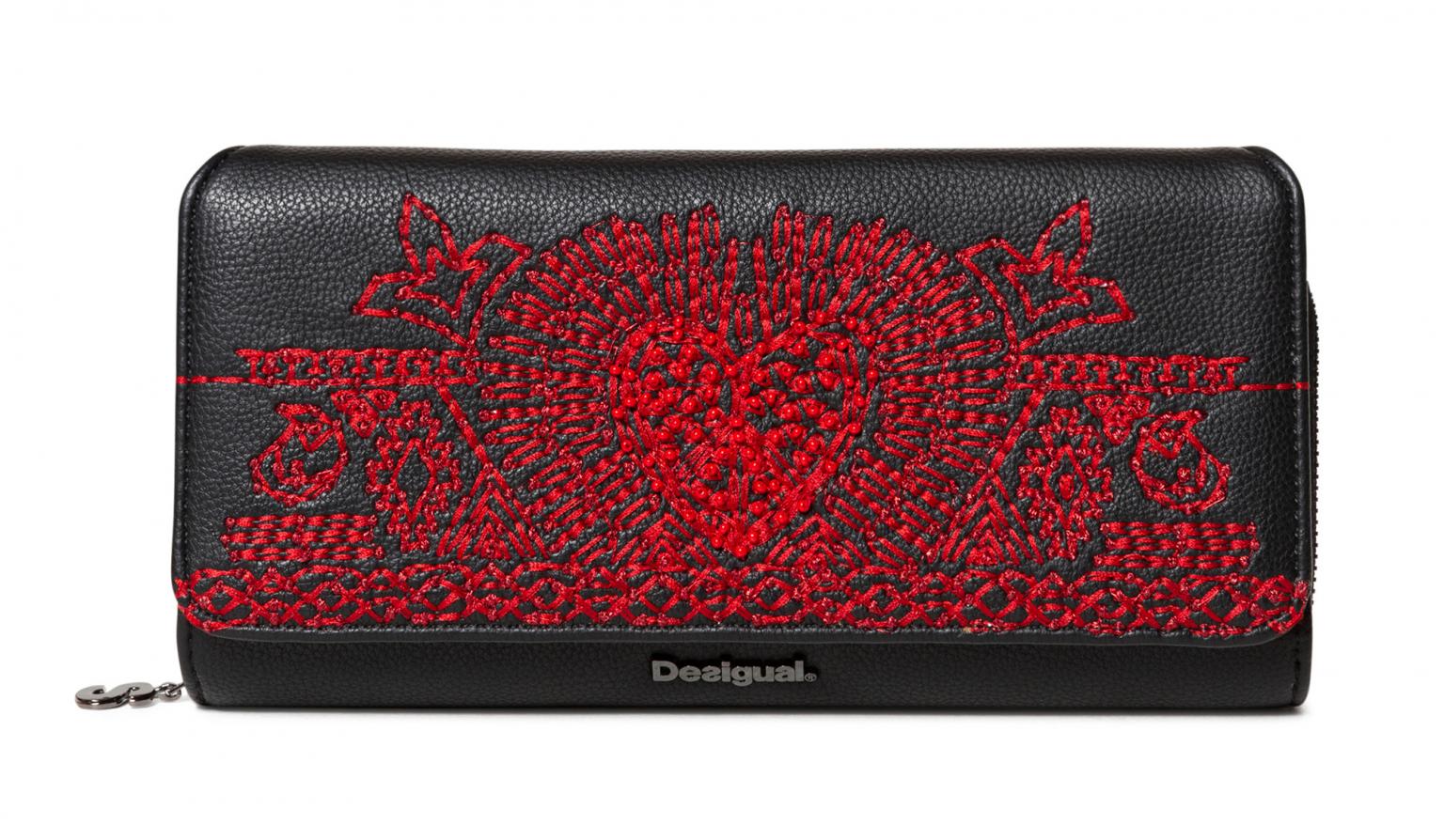 Die Kunstledergeldtasche Beating Heart aus der Serie Maria der Marke Desigual ist aus hochwertigem Lederimitat in der Farbe Negro (schwarz,rot bestickt) gefertigt.
