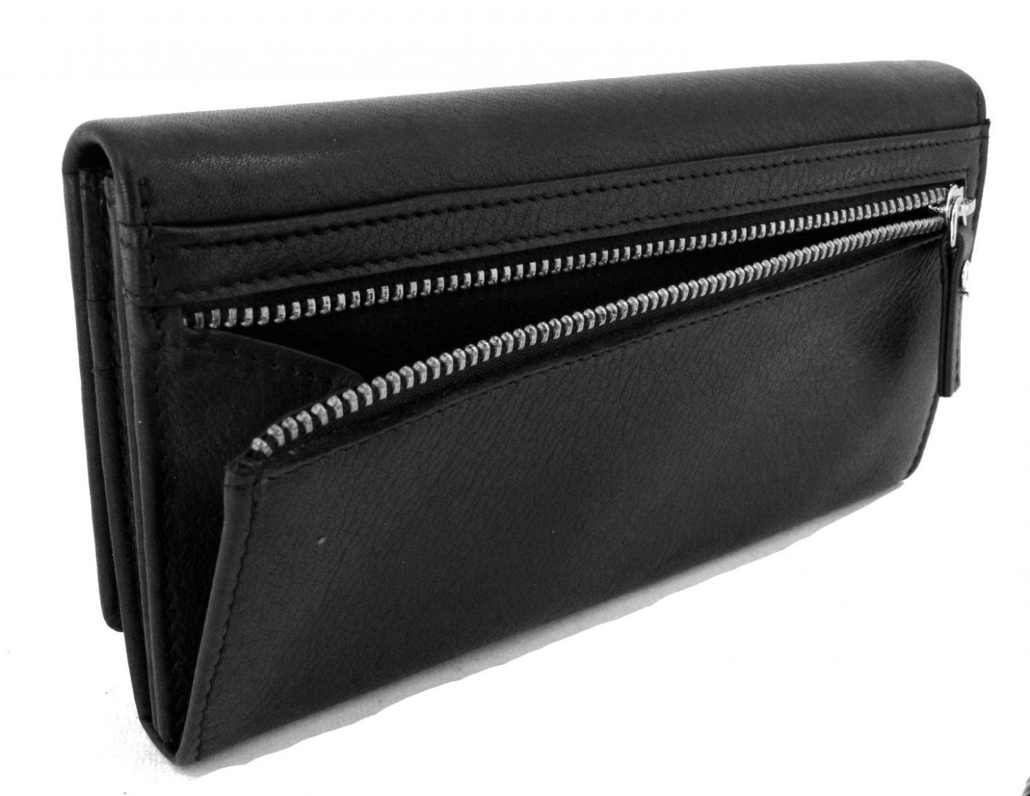 Das zweigeteilte Hauptfach der Brieftasche ist per Überschlag und Druckknopf zu verschließen.