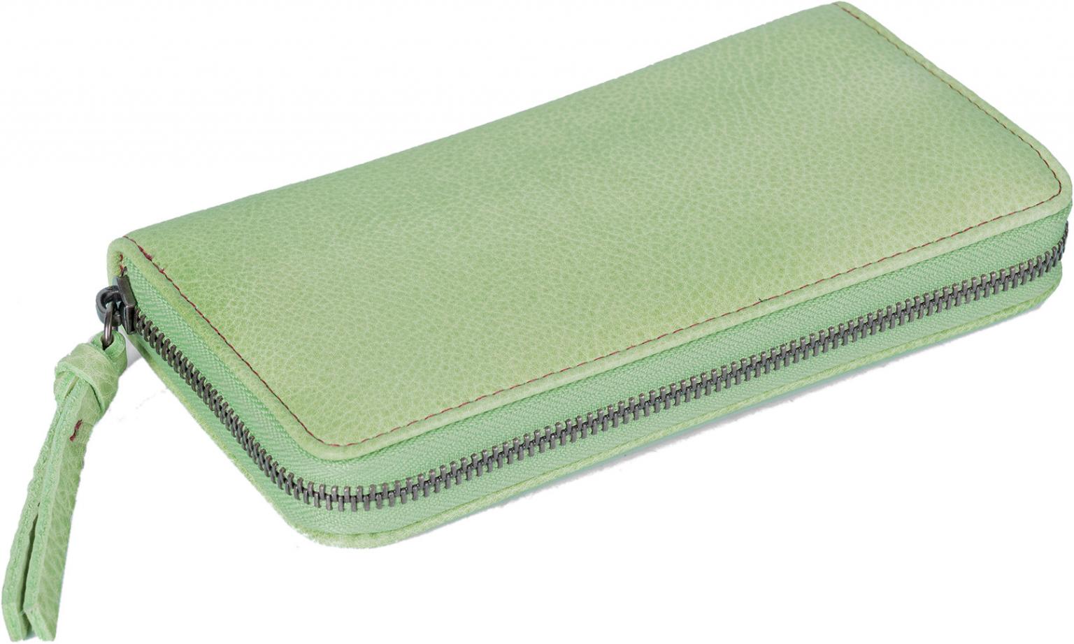 Die Damenbörse ist aus recyceltem Leder in frischem Mintgrün (Peppermint Green) hergestellt. Hierfür werden Lederreste, die sonst entsorgt werden müssten, zerkleinert und mit einem Bindemittel zu einem nachhaltigen neuen Material (Lederfaserstoff) verarbeitet, das in Aussehen und Haptik natürlichem Leder sehr ähnlich ist.
