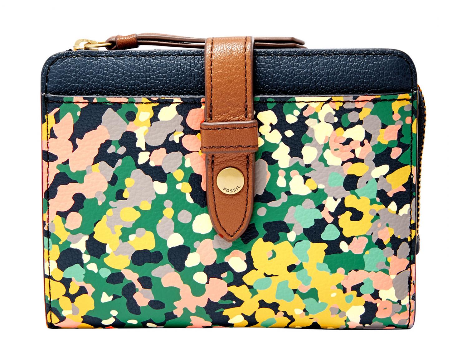 Das modische abstrakte Blumen-Design, die dezenten braunen Lederapplikationen und die übersichtliche Einteilung machen diese Börse zur zeitlosen Begleiterin. Mittels brauner Lederzunge mit Druckknopf läßt sich die Börse verschließen.