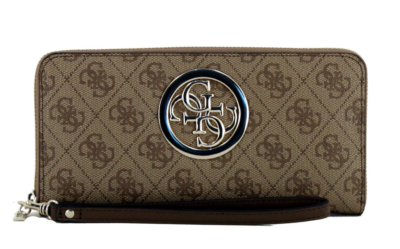 Die Guess Damenbörse aus der Serie Open Road SLG ist aus hochwertigem Lederimitat mit authentisch genarbter Oberfläche gefertigt. Die gesamte Brieftasche ist mit einem Print des 4G-Logos in Spitzenoptik verziert. Durch das große goldfarbene Markenemblem an der Vorderseite erhält das Portemonnaie einen unverwechselbaren Charme. Die Innenseite ist komplett in hellem Gold gehalten.