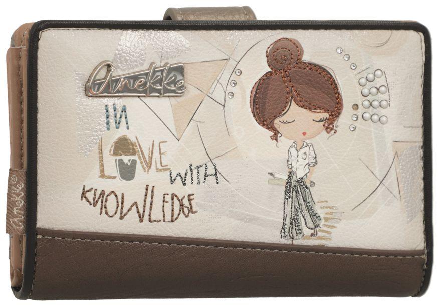 Das gesamte Portemonnaie ist von einer Paspel aus schwarzem Glattlederimitat eingefasst. Im Inneren ist die Geldtasche in harmonisch mit dem Design abgestimmten Farbtönen gehalten, die Fächer sind mit einem Textilfutter mit Anekke-Schriftzug ausgestattet.