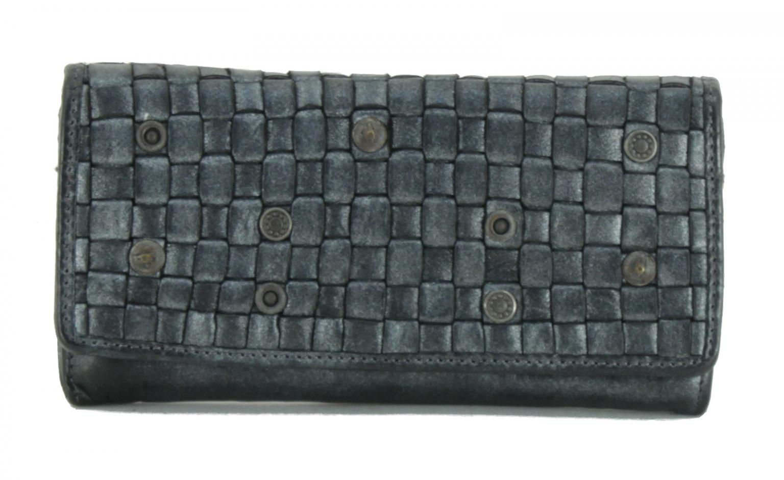 Die Überschlagbörse Adriane der Marke Harbour2nd ist aus hochwertigem Vollrindleder gefertigt. Durch das geflochtene Leder im Überschlag und die eingearbeiteten Nieten kommen die Farbunterschiede im Leder besonders gut zur Geltung. Die gesamte Geldtasche ist mit einer metallisch glänzenden Beschichtung versehen.