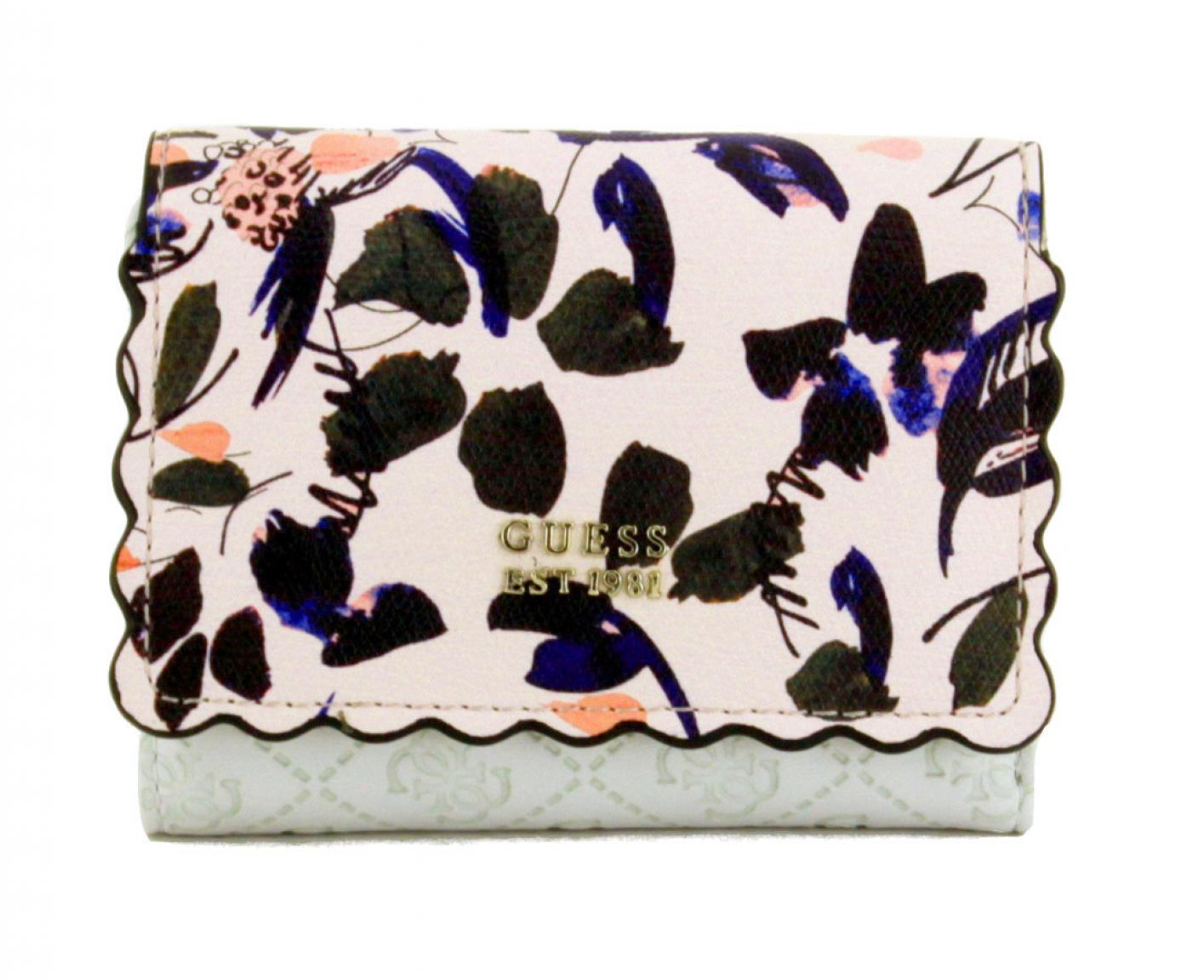 In die Oberfläche sind viele Prägungen des Guess-Emblems im Rautenmuster eingearbeitet. Der Überschlag ist mit einem floralen Muster auf zartem Rosa designed, Im Inneren schimmert die Börse im hellen Goldton.