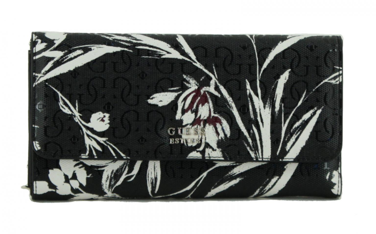 Die gesamte Brieftasche ist mit einer Prägung des Markenlogos sowie einem weißen Blumenprint verziert. Die Innenseite ist komplett in schwarz gehalten.