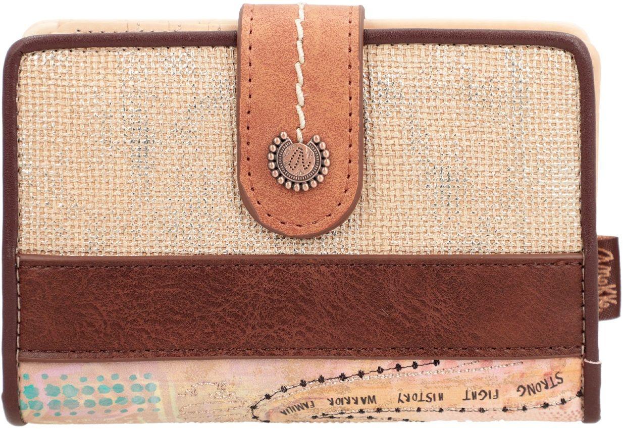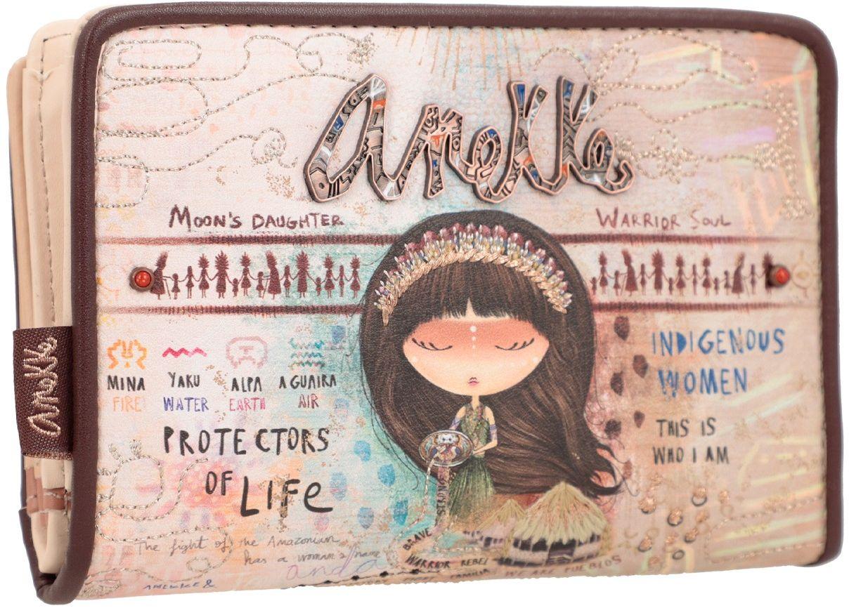 Auf unserer Reise mit Anekke treffen wir im tiefsten Regenwald auf die Menire. Diese Kompaktbörse ist diesen indigenen Frauen des Amazonas-Gebietes gewidmet. Der Print an der Vorderseite des Portemonnaies zeigt Anekke als Quelle, aus der alle Werte die den Frauen und ihren Stämmen wichtig sind, entspringen. Betont durch glitzernde Stickereien und das ungewöhnliche Markenemblem, wird das Motiv hervorragend in Szene gesetzt.