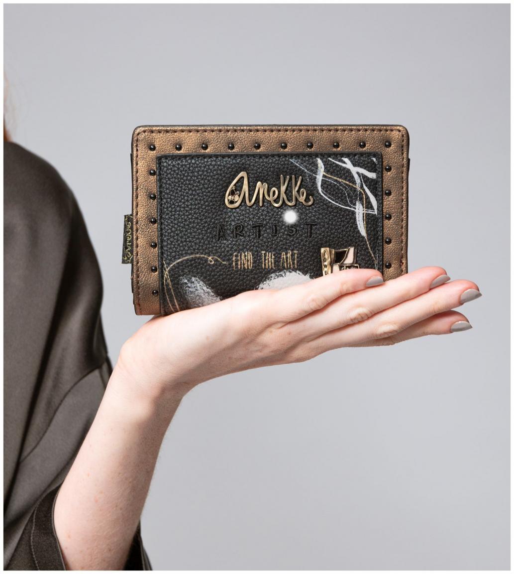 Inspiriert durch die japanische Kunst des 'kintsugi', das Reparieren zerbrochener Gegenstände mit Gold, präsentiert sich diese Klappbörse aus der Linie Nature Shodo der Shoen Kollektion von Anekke als wahres Kunstwerk. Geschwungene Linien in Gold und Beige auf schwarzem Kunstleder sind angelehnt an die Muster, die bei dieser Technik entstehen.