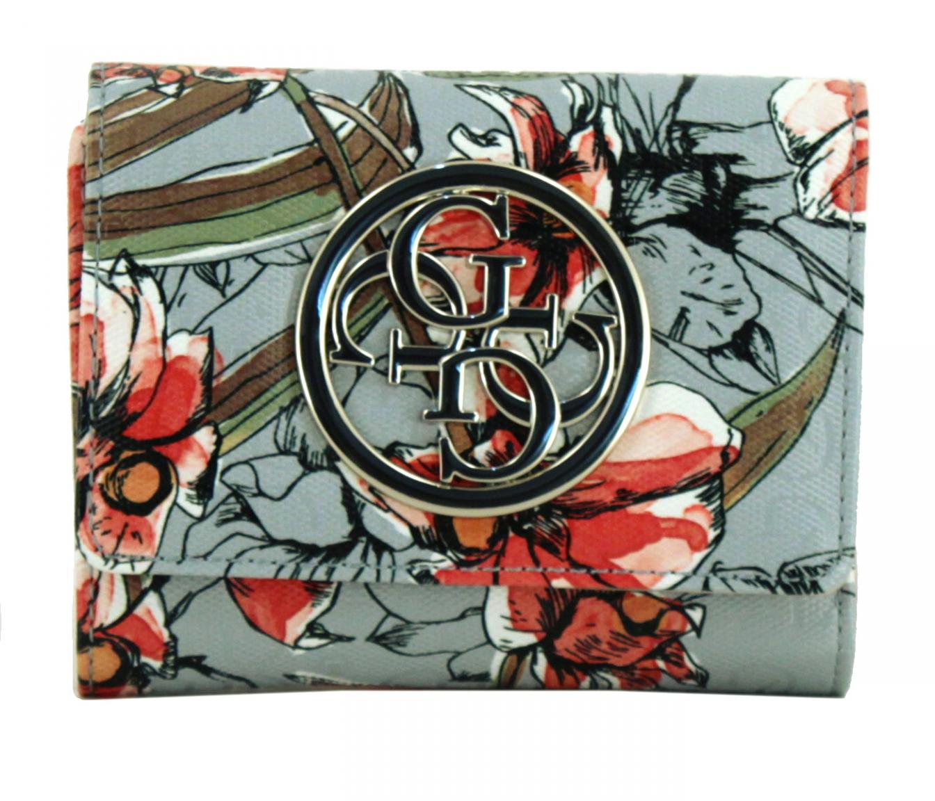 Die Geldbörse Small Trifold von Guess aus der Serie Gioia SLG ist aus hochwertigen Materialien gefertigt und per Überschlag und Druckknopf zu schließen. Die gesamte Oberfläche ist mit einer Prägung des Markenlogos verziert. Der auffällige Blumenprint macht die hellblaue Geldtasche zu einem richtigen Eyecatcher. Das große Metallemblem an der Vorderseite betont das außergewöhnliche Design.