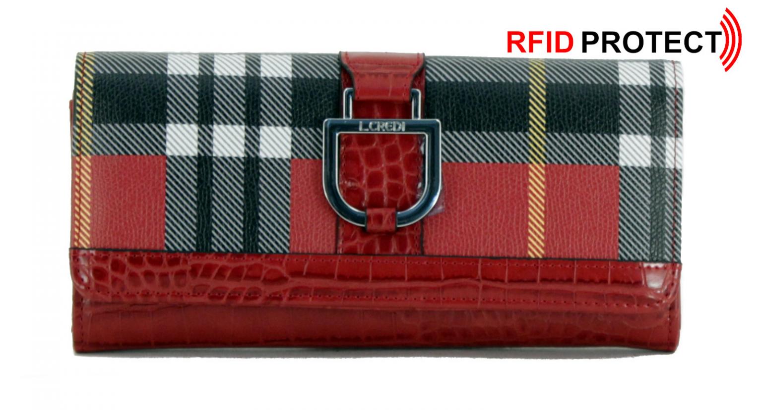 Die Überschlagbörse aus der Serie Debby von L.Credi ist ein ganz besonderer Blickfang. Das rote Reptillederimitat in Kombination mit dem karierten Überschlagt verleiht der Geldtasche ein außergewöhnliches Design.