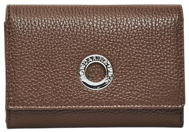 Ein echter Blickfang ist der große Metallring an der Vorderseite der Klappbörse. In diesem ist auch der Markenschriftzug zu erkennen. Im Inneren ist das Portemonnaie ebenfalls komplett in Braun gehalten. Natürlich darf hier das Markenzeichen, die eingeprägte Mandarinente, nicht fehlen.
