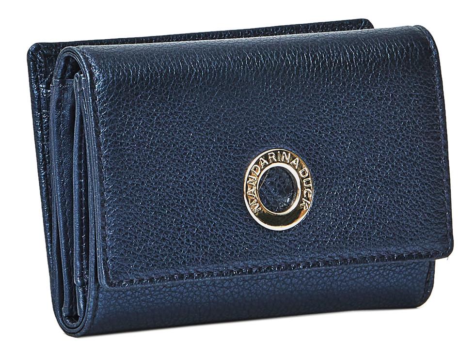 Ein echter Blickfang ist der große Metallring an der Vorderseite der Klappbörse. In diesem ist auch der Markenschriftzug zu erkennen. Im Inneren ist das Portemonnaie ebenfalls komplett in dunklem Blaugehalten. Natürlich darf hier das Markenzeichen, die eingeprägte Mandarinente, nicht fehlen.