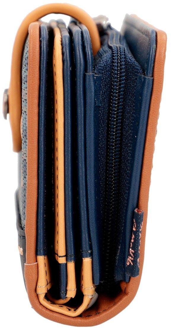 Das ansprechende Design mit textilen Druck und der vielen Cutouts zieht bereits alle Blicke auf sich. Zarte Stickereien vollenden das geschmackvolle Aussehen des Portmonees.