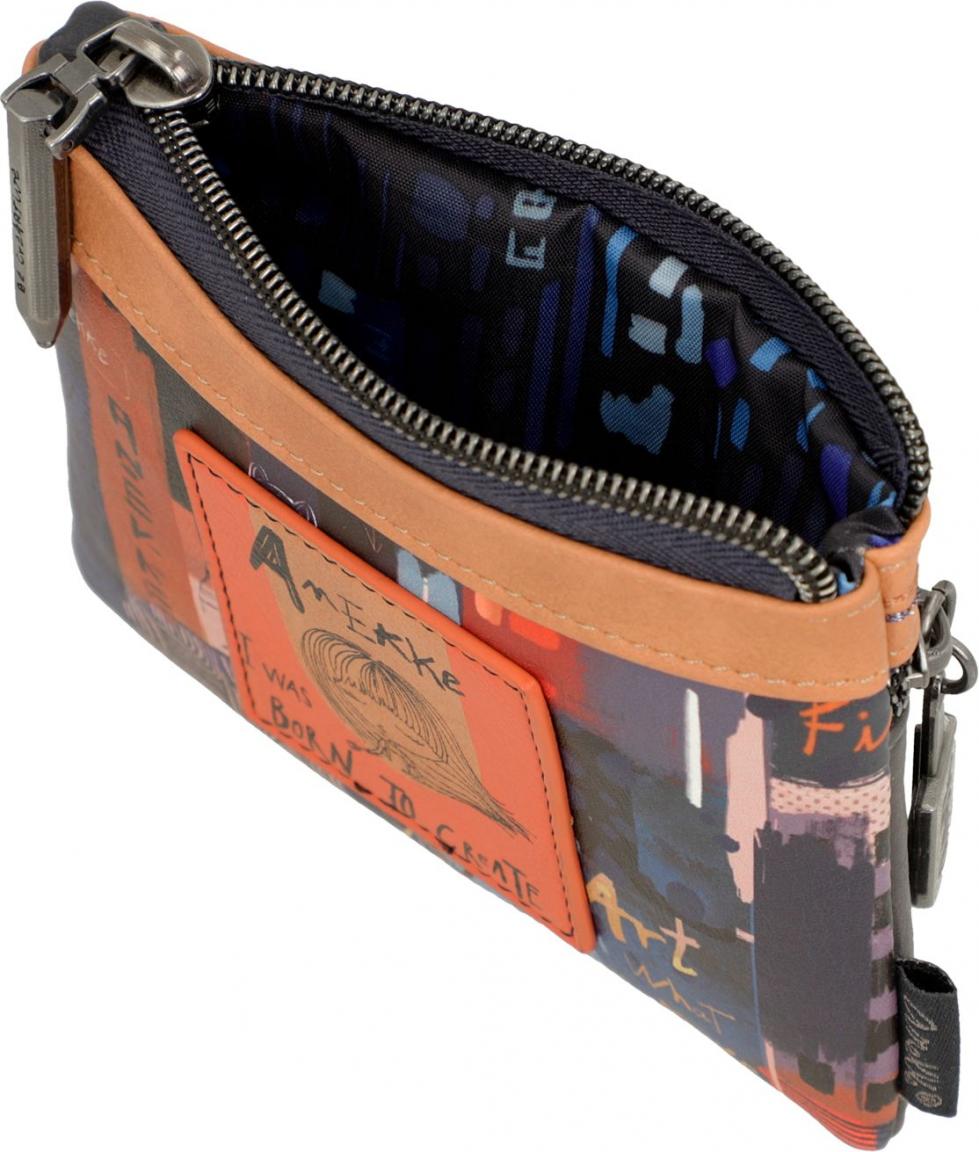 Die Vorderseite des Etuis ziert der charakteristische Print mit einer verträumten Anekke in den Straßen einer Stadt. Lichter und Gebäude werden stilisiert durch abstrakte Formen und glänzende Stickereien in kräftigen Farben dargestellt. Ein modern gestaltetes Markenemblem betont den ungewöhnlichen Look der Münzbörse.