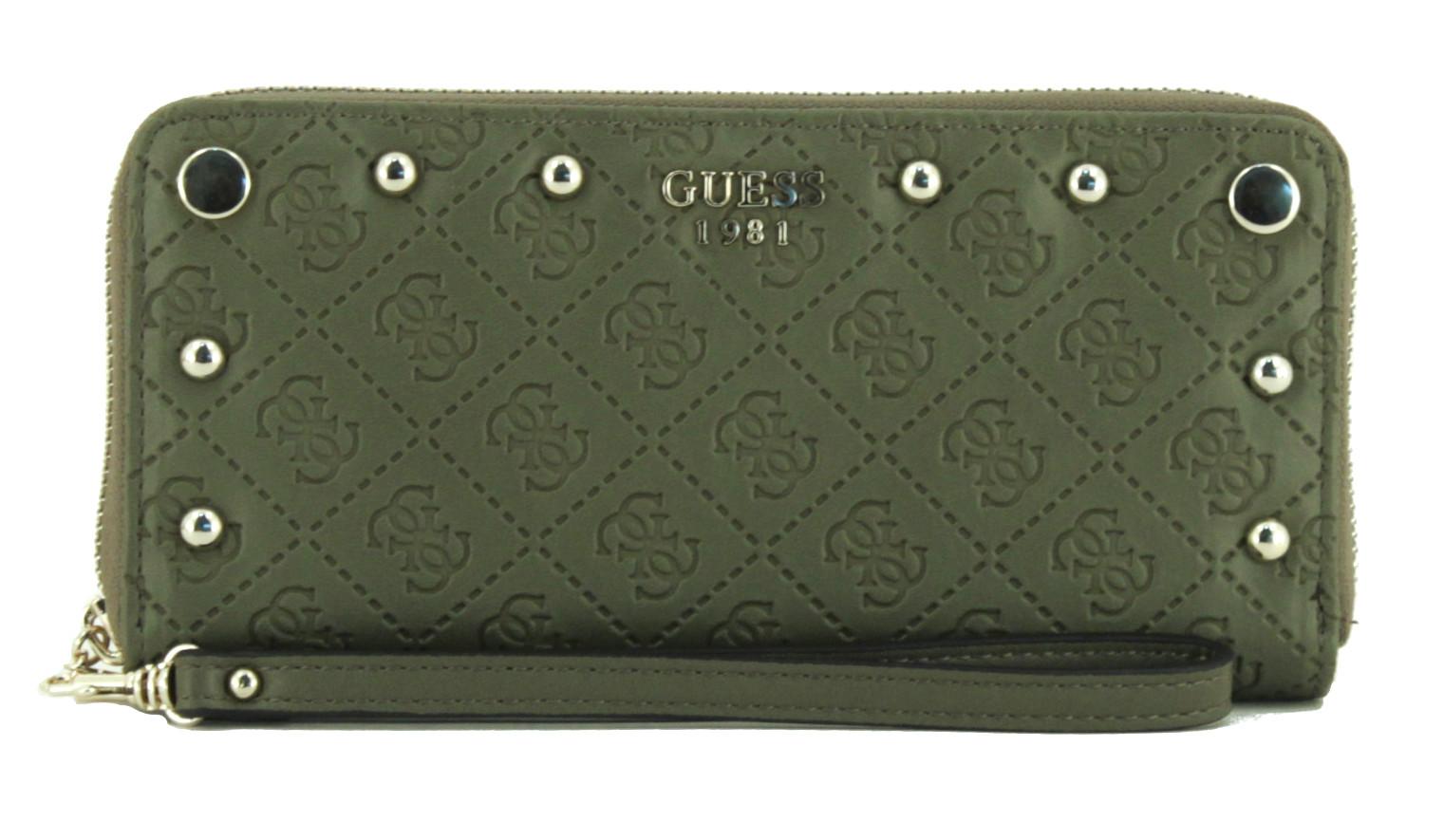 Die Damenbörse aus der Serie Coast to Coast SLG der Marke Guess ist aus hochwertigen Materialien gefertigt. Charakteristisch für diese Serie sind die Alloverprägung des Guess-Logos sowie die goldfarbenen Ziernieten an der Vorderseite. Die Innenseite ist in einem hellen Goldton gehalten.
