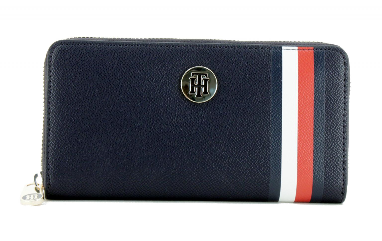 Dieses Portemonnaie aus der Serie Honey LRG ZA der Marke Tommy Hilfiger ist aus hochwertigem Lederimitat in der Farbe Corporate (dunkelblau mit Streifen) gefertigt. Die Kartenfächer im Inneren der Damengeldtasche sind in rot, weiß und blau gehalten.