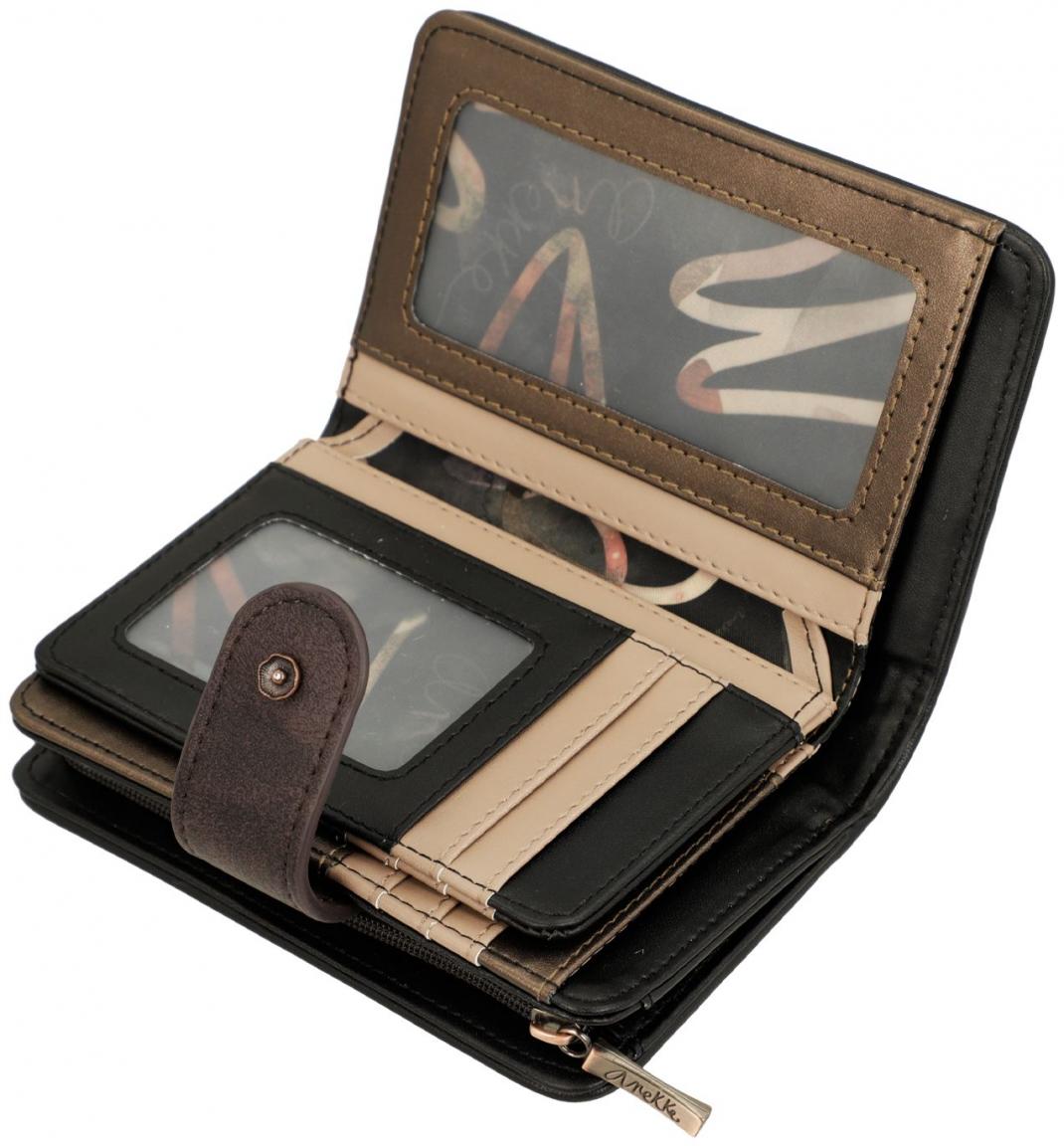 Innen ist das Portemonnaie in erdigen Tönen und metallischen Nuancen gehalten. Die einzelnen Fächer sind mit passendem Textilfutter ausgestattet.