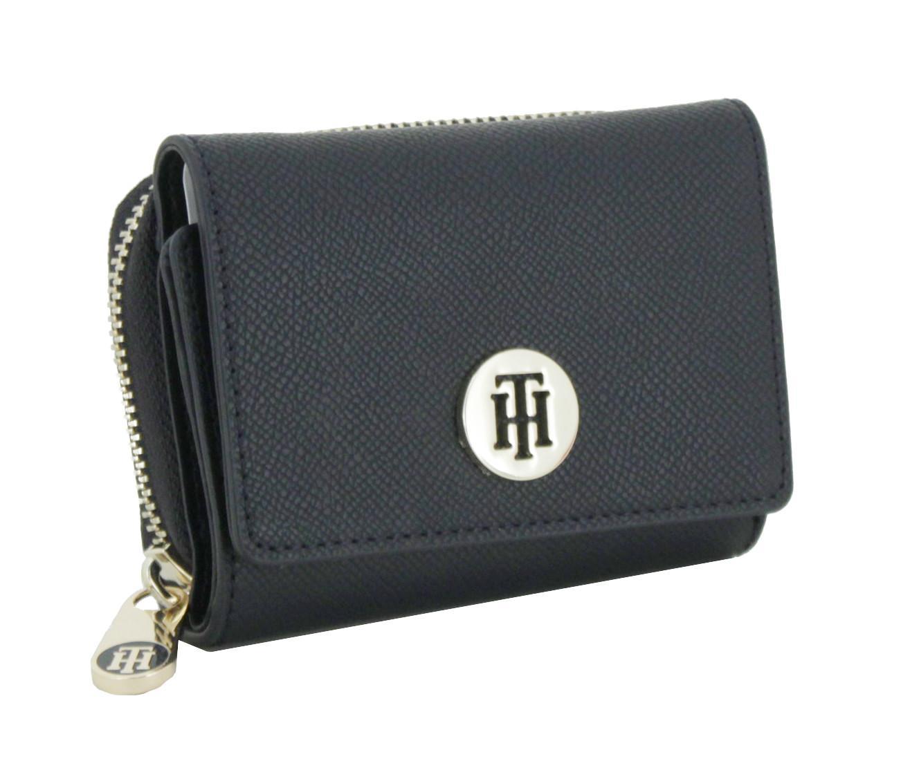 Das kompakte Portmonee von Tommy Hilfiger aus der Serie Honey Med Flap ist aus hochwertigem Lederimitat in der Farbe Desert Sky (dunkelblau) gefertigt. An der Vorderseite der Überschlagbörse prangt ein goldfarbenes Monogramm-Emblem. Die Oberfläche der Überschlagbörse ist fein genarbt.