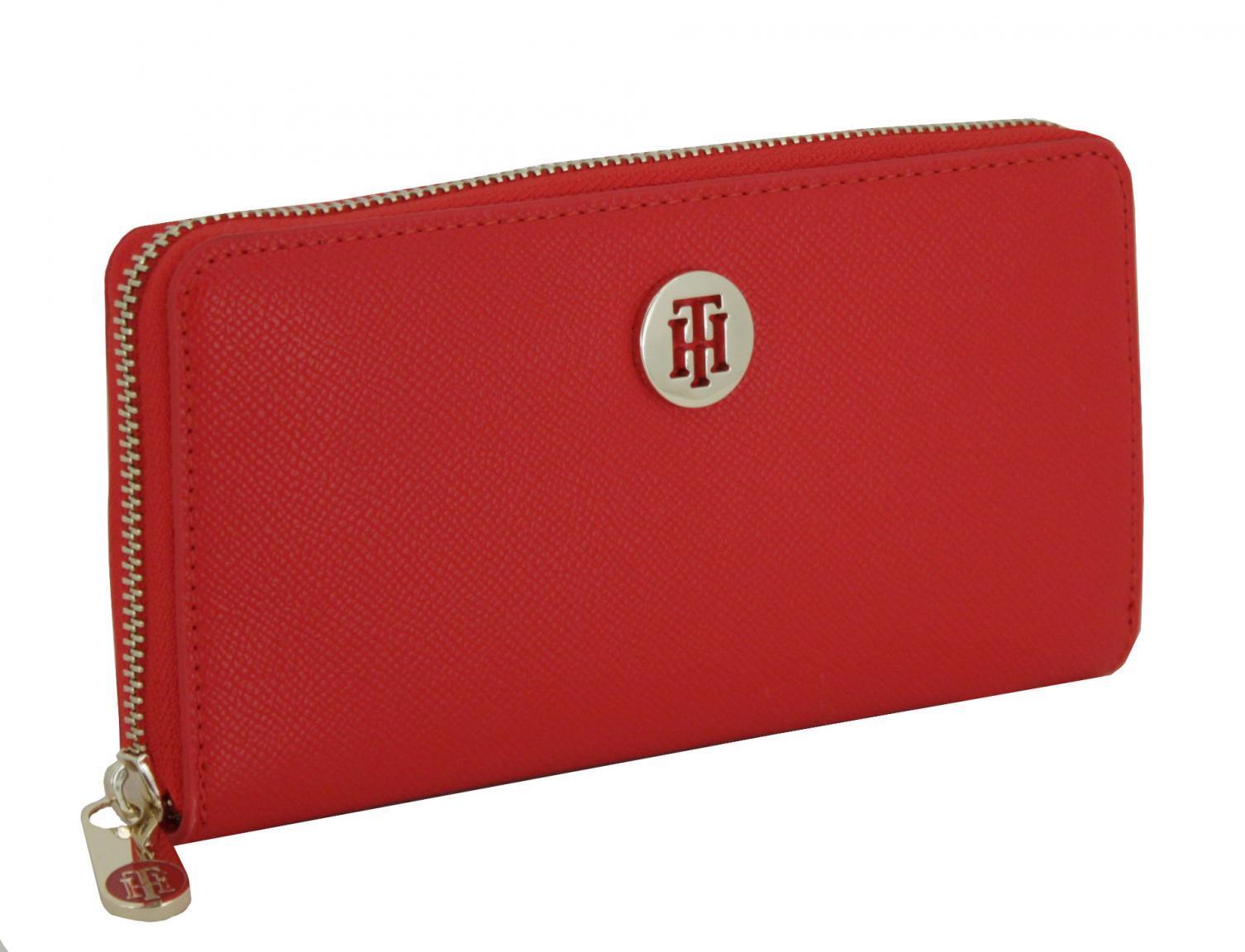 Das Portmonnaie von Tommy Hilfiger aus der Serie Honey Large ZA ist aus hochwertigem genarbtem Lederimitat, in der Farbe Red (Rot) gefertigt. Der feurige Farbton gemeinsam mit den goldfarbenen Metallteilen hat Ausdrucksstärke. Im Textilfutter der Börse ist Ton-in-Ton das Monogramm eingewebt. Innen ist die Geldtasche in blau und schwarz gehalten.