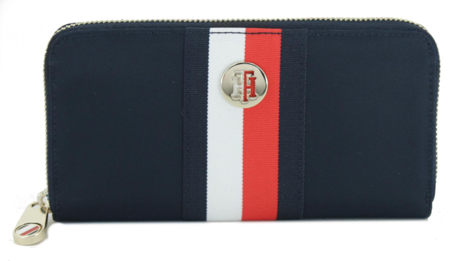 Das Portmonnaire Poppy Large ZARG ZA der Marke Tommy Hilfiger ist aus hochwertigem dunkelblauem Perlongewebe gefertigt. Das Gurtband mit den typischen Hilfiger Farben blau, rot und weiß, sowie das goldfarbene Monogramm-Emblem setzen unverwechselbare Akzente.