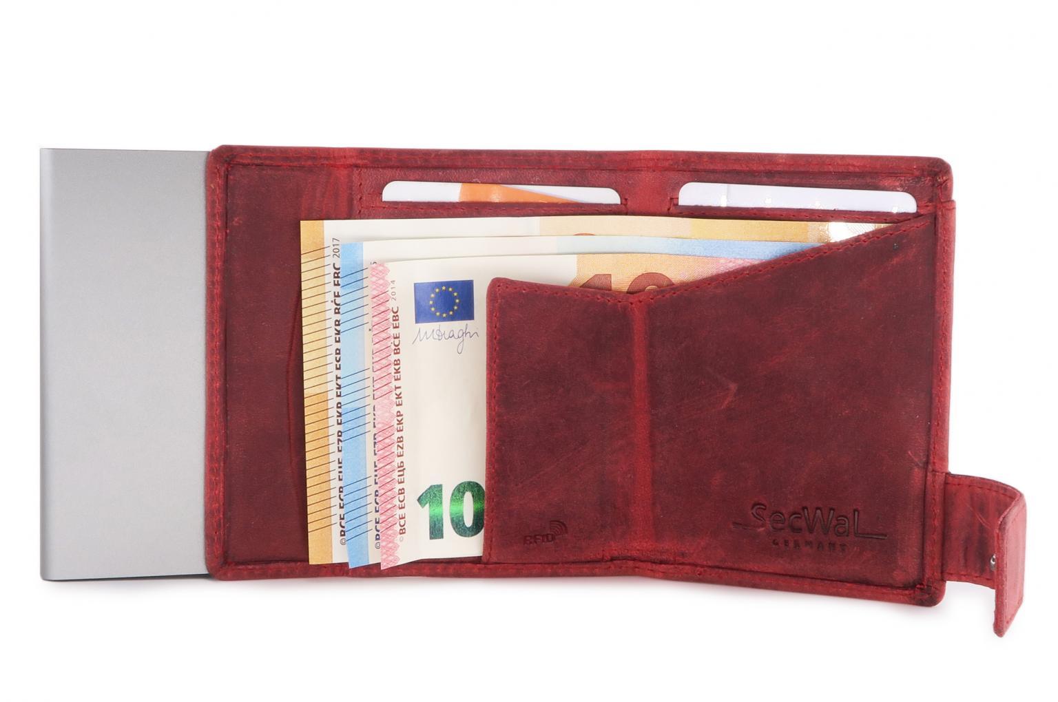 Dieses Kreditkartenetui mit Münzfach und Scheinfach der Marke SecWal ist aus hochwertigem Hunter Rindleder in Antiklederoptik gefertigt, die Kartenhülle ist aus Aluminium gefertigt. Das Vintagedesign wirkt besonders sportlich.