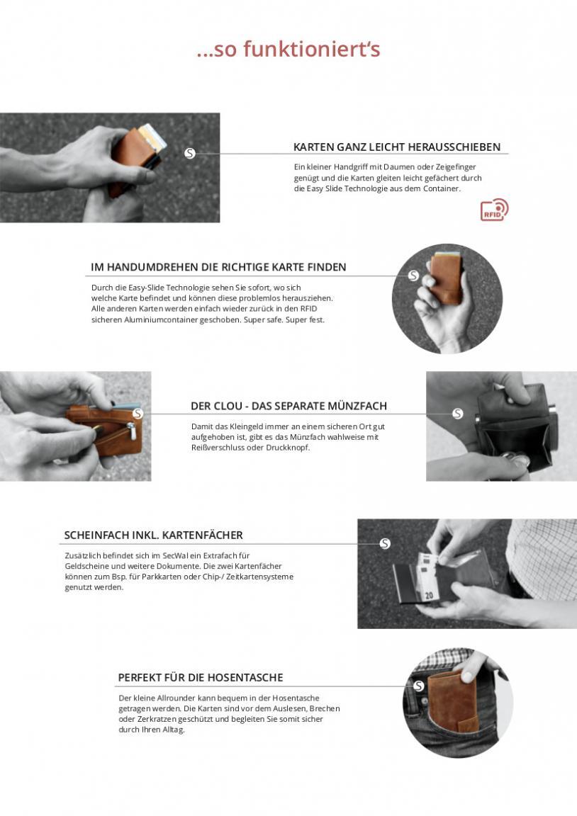SecWal bietet Kartenetui und Geldbörse in einem an. So finden hier auch weitere Karten und Geldscheine in der Lederbörse Platz. Im Gegensatz zu anderen Cardprotectoren bietet dieses Etui von Secwal auch ein großes übersichtliches Münzfach, verschließbar mit einem Druckknopf