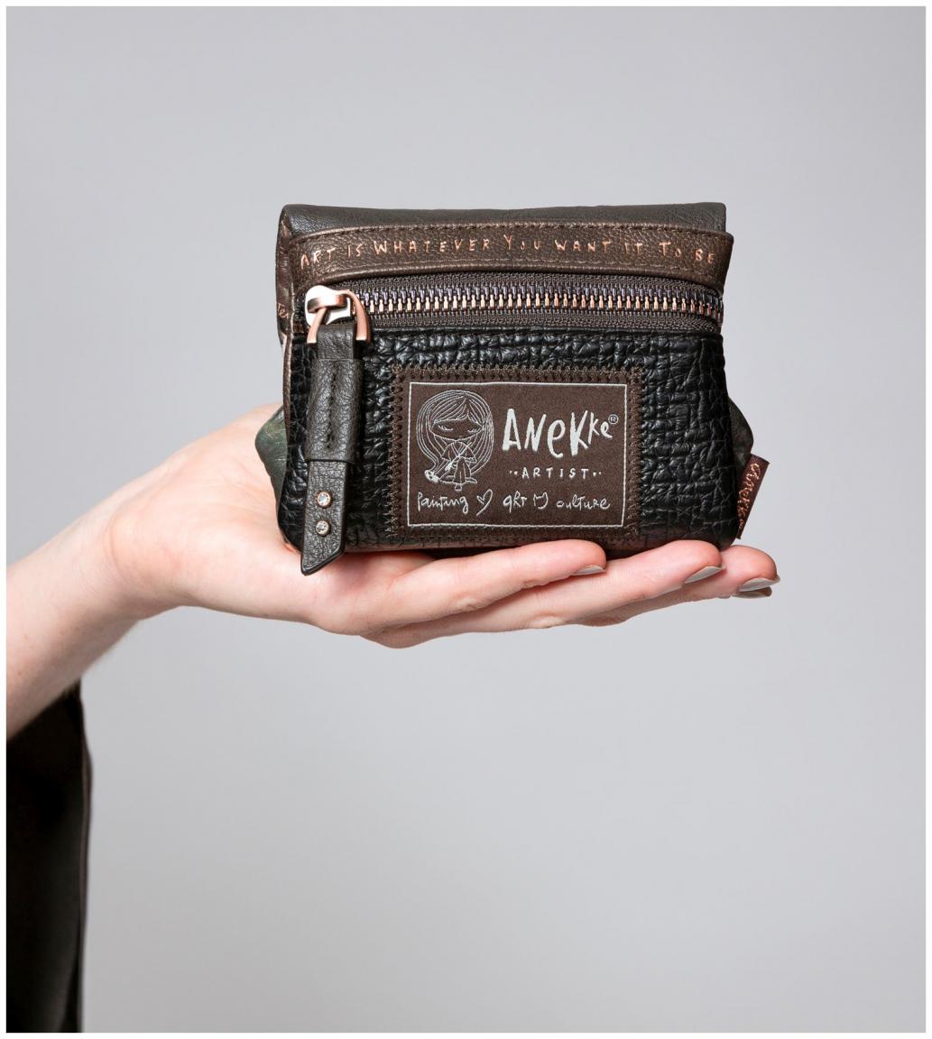 Auf ihrer Reise nach Japan lernte Anekke die Künstlerin Uemura Shoen kennen, der sie eine komplette Kollektion widmete. Diese kleine Überschlagbörse aus der Linie Padded ist durch die Kunst dieser außergewöhnlichen Frau inspiriert. Die zweigeteilte Münzbörse ist aus glattem Kunstleder gefertigt. Dabei ist das Fach mit Bügelverschluss mit einem abstrakten Kunstdruck verziert. Derselbe Print findet sich auch an der Innenseite des Überschlags.