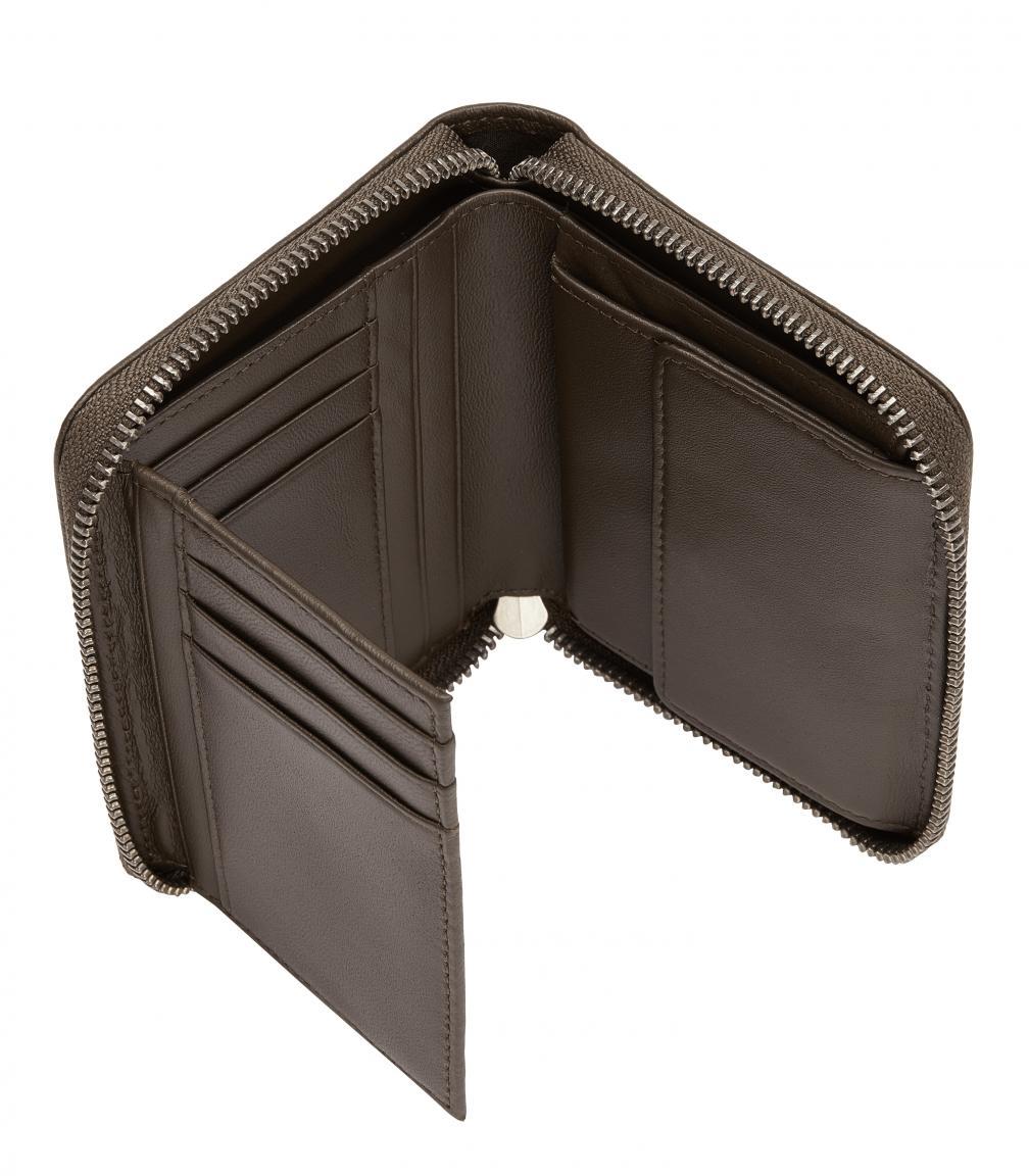 Die Ziparoundbörse Conny Wallte Medium der Marke Liebeskind ist aus feinstem Rindsleder in der Farbe Nori green (Dunkelbraun/grün) gefertigt. Das weiche, leicht genarbte Glattleder liegt angenehm in der Hand. Durch die einheitlichen Farbtöne wirkt die Börse sehr schlicht und unauffällig, kann aber mit einer geordneten Einteilung punkten. Der Rundumzip sorgt für Sicherheit.