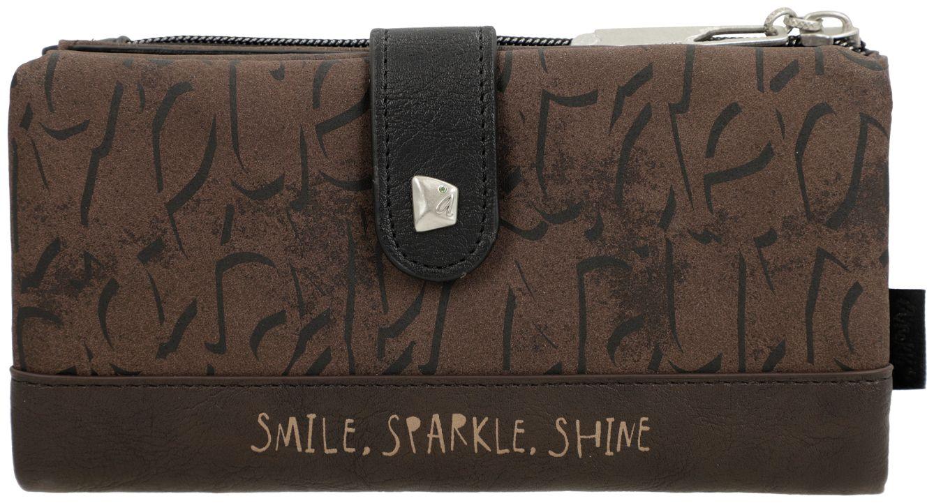 Im Inneren ist das Portemonnaie passend zum Thema in erdigen Tönen gehalten. Das herausnehmbare Etui ist komplett aus braunem Kunstleder gefertigt. Die Fächer der Geldtasche sind mit einem abgestimmten Textilfutter ausgestattet.
