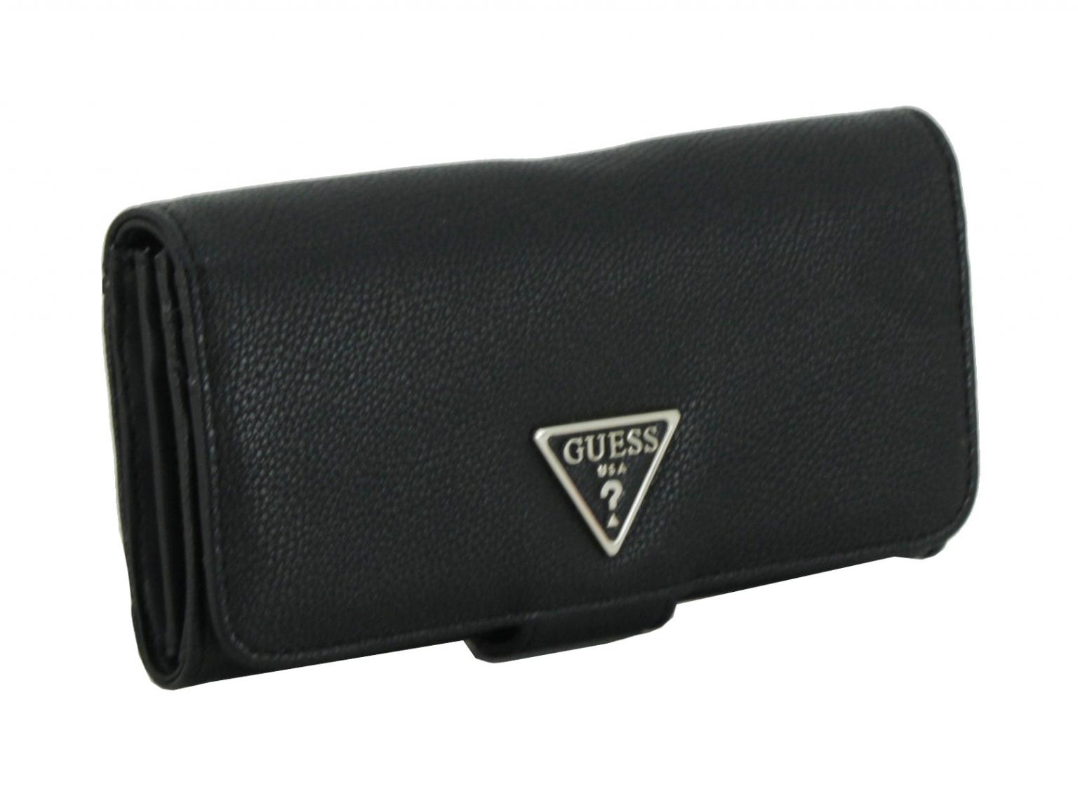 Diese Geldtasche von Guess aus der Serie Sandrine SLG ist aus hochwertigem Lederimitat mit authentischer Narbung in der Farbe Black (schwarz) gefertigt. Den Überschlag der Brieftasche ziert ein schwarz/gold farbenes Markenemblem.