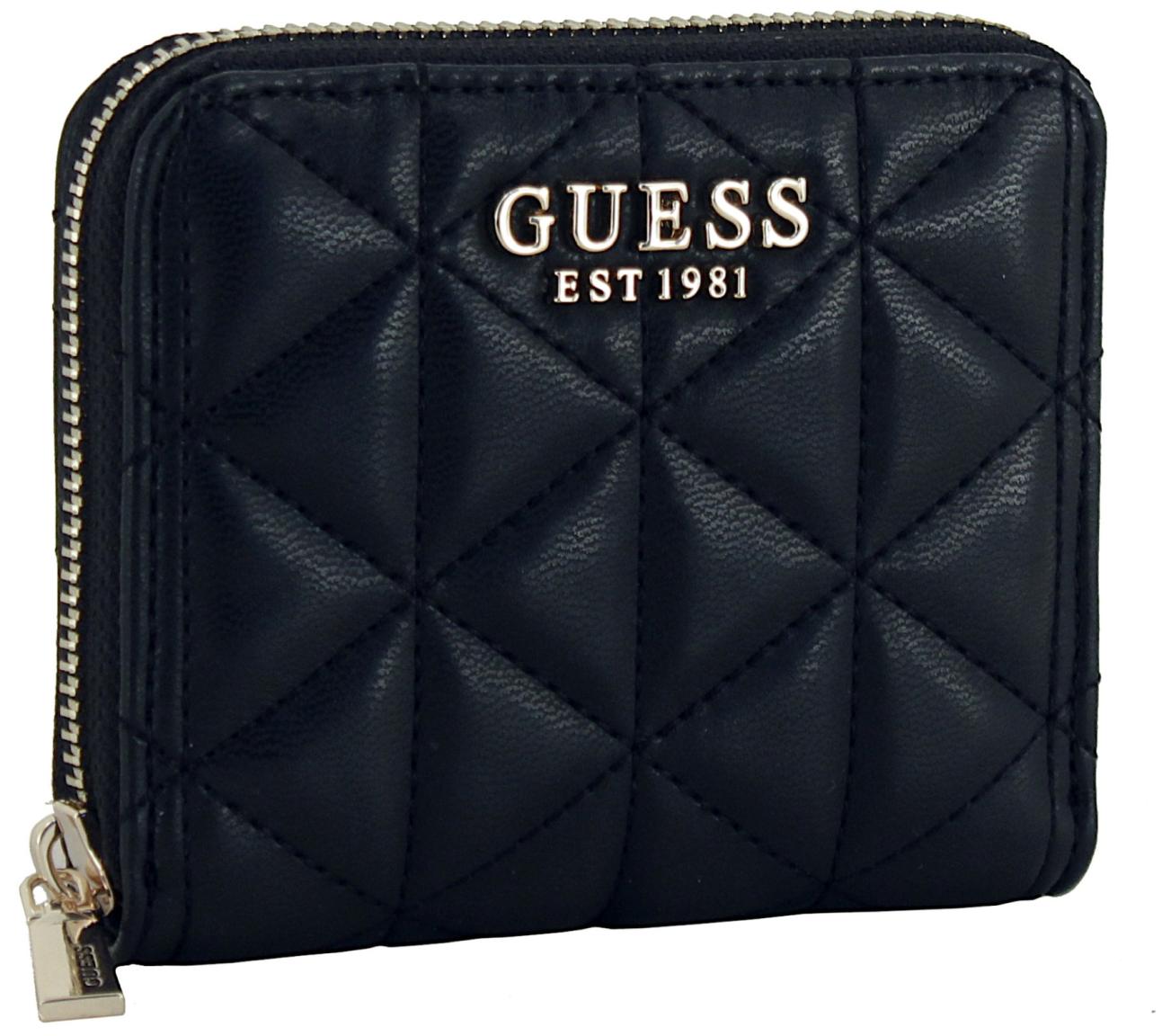 Kompakt und dadurch auch ideal für kleinere Handtaschen geeignet ist diese Geldbörse aus der Kollektion Paisleigh SLG von Guess. Gefertigt ist das Wallet aus geschmeidigem, glattem Kunstleder in klassischem Schwarz (Black). Die markante Steppung in Dreieckform verleiht dem Portemonnaie eine besondere dreidimensionale Textur. Goldfarbene Hardware sorgt für den zeitlos edlen Look der Börse.
