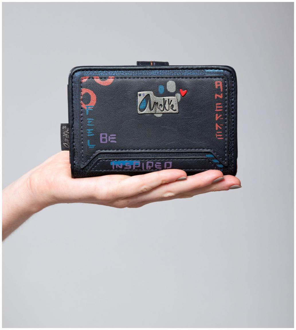Gefertigt ist die Brieftasche aus dunkelbuntem Lederimitat mit blauer Grundfarbe. Der auffällige Print in kräftigen Farben macht das Portemonnaie zum echten Blickfang. Ganz markentypisch finden wir auch hier liebevolle kleine Details, die das Thema Japan und Kunst aufgreifen. Auch der künstlerisch gestaltete Markenschriftzug an der Vorderseite des Wallets passt sich hervorragend an das Design an.